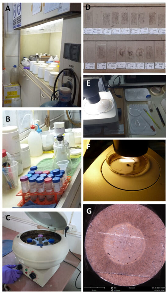 Standard methodology. (A) Digestion treatment with HCL and HF. (B) Sieving process using 10 and 25 micron filters. (C) Remove excess water from the residues by excess centrifugation at 1000 rpm. (D) Palynological slides were prepared using Trabasil as an adhesive. (E,F) Review the residues to analyze the content, abundance, and preservation of the palynomorphs. (G) Chitinozoans from CICYTTP-Pl 1786 mounted into a stub for SEM illustration (picture taken into the SEM).