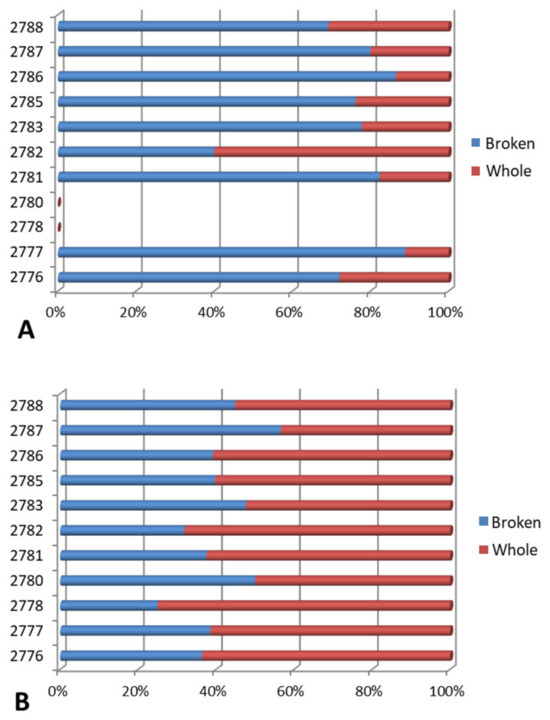 Percentages of whole and broken palynomorphs recovered in each of the samples with the standard technique (A) and the modified technique + Sodium hexametaphosphate (B).