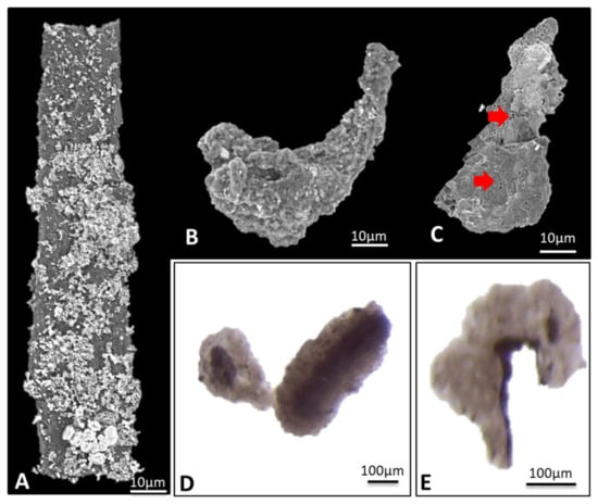 (A) SEM image of a chitinozoan with mineral adhered to the wall, CICYTTP-M-550 (CICYTTP-Pl 2777). (B) Possible fragment of scolecodont equivalent to internal mold-cast without the fossil wall, CICYTTP-M 551 (CICYTTP-Pl-2778). (C) Poorly preserved chitinozoans? with small holes on the exine (red arrow), CICYTTP-M 552 (CICYTTP-M-2786). (D,E) Chitinozoans (fragmented) are manually detached from masses of AOM (Amorphous organic matter) and minerals from residues in a Petri dish. Notice the shape maintained after the chitinozoan was released (CICYTTP-Pl-2781).
