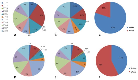 Statistical comparison of the recovered broken and whole palynomorphs in each sample. (A–C). Standard technique applied (A) Broken. (B) Whole. (C) General overview of the results (based on the total amount of all samples) indicates low recovery of slightly, complete chitinozoans). (D–F) Sodium hexametaphosphate and modifications to the standard technique (D) Broken. (E) Whole. (F) It shows a decrease in broken palynomorphs and a significant increase in complete and slightly fragmented specimens. Total values (%) of Subfigures (A) + (B) and (D) + (E) is 100% (±1 by decimals).