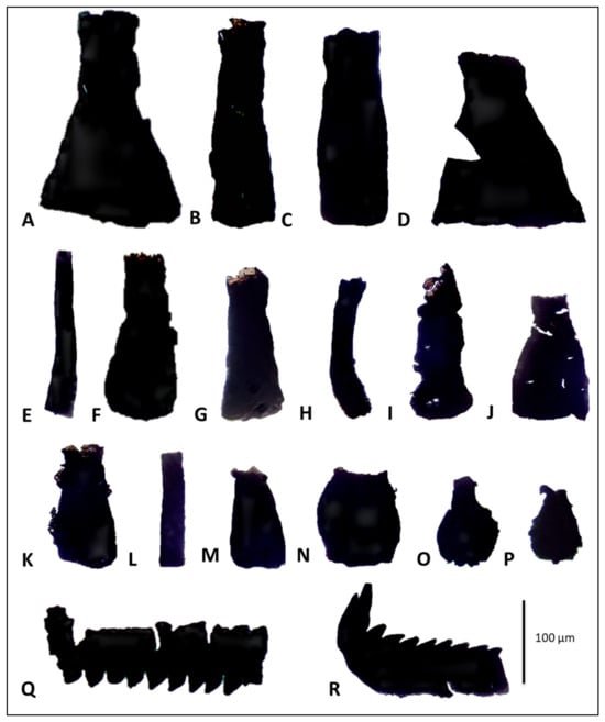 Their taxonomic classification is mainly based on the external silhouette, and they proved to be very useful in biostratigraphic dating of Early Paleozoic fine-grained sediments []. The progressive thermal alteration of the test changes from translucent and amber-colored to brown and finally black (opaque). Hence, they are useful and helpful, especially in those metasedimentary successions (highly tectonic-metamorphosed rocks like green-schist facies) bearing organic matter opaque. However, ongoing palynological analyses have shown that standard techniques are applied by considering their large size, varying from 50 µm to 2 mm in length. It needs to avoid crushing pieces of rocks less than 1 cm. Moreover, for recovering complete specimens of extremely fragile and brittle chitinozoans, standard techniques need modification and adaptation based on the results obtained from different types of rocks [,,]. In this case, direct observation at the surface of the rock slabs and petrological slides constructed along the bedding plane can also be useful [].