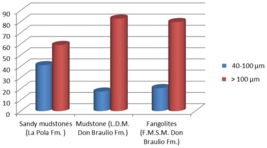 The palynomorphs are best preserved in fine-grained sediments such as mudstones, siltstones, micritic limestones, cherts, and coals [,,]. It has been found that there is a relationship between the size of palynomorphs and the grain size of the sediment where they are found. Palynomorphs ranging from 10 to 100 µm are commonly found in fine sediments such as mudstones, silts, and clays. In contrast, palynomorphs in medium to fine sandstones generally have larger sizes, like many chitinozoans [,]. However, this relationship does not agree when considering the chitinozoans found in the Katian?–Hirnantian sequence. A statistical analysis has revealed two large groups: (1) sizes between 40 and 100 µm and (2) sizes larger than 100 µm (Figure 11). In the La Pola Formation, the sandy mudstone facies (Figure 1 and Figure 2) yielded better-preserved palynomorphs larger than 100 µm, in line with the theoretical relationship. Although, it also preserved almost 50% of small palynomorphs. This close relationship between small and large palynomorphs could be related to the original sedimentation conditions of the La Pola Formation in a clastic platform with calm, low-energy water environments []. A specific case is presented in sample CICYTTP-Pl-2782, where large chitinozoans were found associated with colonies of Gloeocapsomorpha and graptolites.