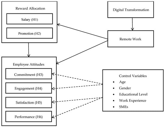 Digital transformation and remote work continue to reshape the nature of work, yet the implications for salaries and promotions in SMEs continue to be poorly understood. This study investigates how reward allocation mediates the relationship between remote work and employee attitudes, addressing the organizational challenges of aligning human resource practices with digitalization work models in the European context based on the social exchange theory and data collected from n = 615 participants, primarily from SMEs, which were analyzed using PLS-SEM software and WarpPLS 7.0. The findings reveal that remote work not only strengthens workers’ engagement and satisfaction but also channels their efforts toward achieving outcomes and reward allocation, reducing the reliance on physical presence and visibility. Digital transformation enables SMEs to adopt more flexible and fairer HR practices, with remote work also contributing to organizational resilience, employee agility, and competitiveness. This research advances the theoretical understanding of HRM in the context of digital transformation, offering SMEs a guide to building a suitable reward system that promotes both individual well-being and sustainability.