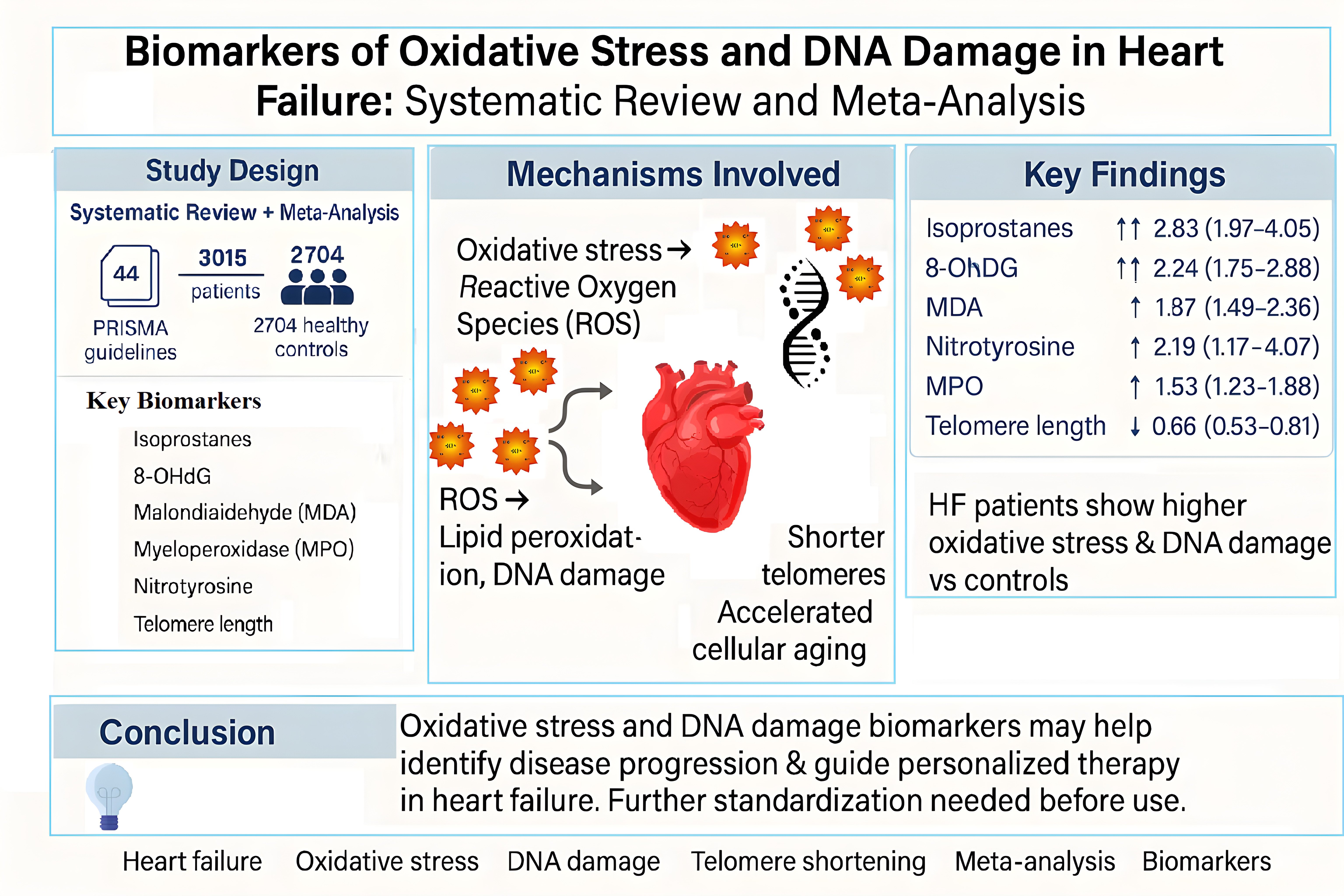Background: Oxidative stress is a key driver of heart failure (HF) pathophysiology, promoting myocardial injury, inflammation, and remodeling. Although numerous biomarkers of oxidative stress and DNA damage have been investigated in HF, their clinical relevance remains uncertain. This systematic review and meta-analysis aimed