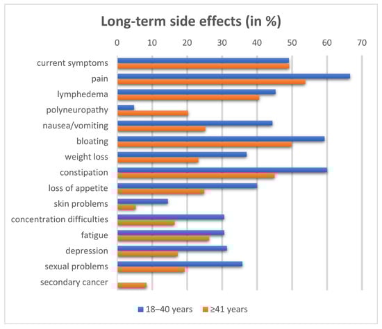 Background/Objectives: Ovarian cancer is typically diagnosed in postmenopausal women, so there are limited data available for young adult cancer survivors (YACS). The aim was to assess the patient perspective of YACS. Methods: In this international and multicenter cross-sectional survey study, patient history, long-term side effects, and patient perspective were assessed. Long-term survival was defined as survival of at least five years after cancer diagnosis. Two groups were defined: (1) 18–40 years and (2) ≥41 years. Results: Altogether, 1833 long-term survivors (LTS) have been recruited, with 1771 patients ≥41 years and 62 patients 18–40 years at recruitment. FIGO stages were similar; among the patients, 99.0% had received primary surgery followed by chemotherapy in 90.3%. Almost 50% still experienced long-term side effects. Patients ≤ 40 years reported more frequently not only gastrointestinal symptoms such as nausea/vomiting (44.4%, p = 0.01), bloating (59.3%, p = 0.038), and constipation (60%, p = 0.015) but also depression (31.4%, p = 0.02), lymphedema (45.3%, p = 0.026), and concentration difficulties (30.6%, p = 0.002). Distress levels were also higher in YACS, especially concerning insurance/finances, work/school, child care, worries, and sadness. Polyneuropathy and secondary cancer were the only side effects that were more frequent in the elder cohort (polyneuropathy: 20.3% vs. 4.3%, p = 0.002, and secondary cancer: 8.4% vs. 0%, p = 0.014). YACS were more physically active (p = 0.003) and interested in studies about long-term cancer survivorship in 87.2%. Conclusions: Long-term side effects are equally common in YACS after ovarian cancer, but with a focus on practical problems, mental health, gastrointestinal problems, and sexuality. This knowledge should be incorporated into follow-up care of ovarian cancer patients in order to improve quality of life.