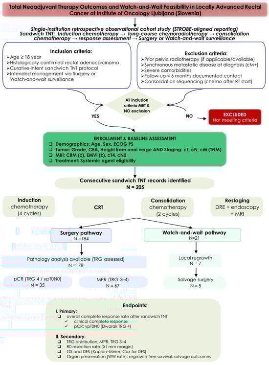 Background/Objectives: Total neoadjuvant therapy (TNT), integrating systemic chemotherapy and radiotherapy before surgery or surveillance, has become a standard approach for locally advanced rectal cancer (LARC). However, optimal sequencing strategies and long-term outcomes of watch-and-wait (W&W) following sandwich TNT remain insufficiently characterized. We evaluated oncologic outcomes and treatment response in patients treated with an institutional sandwich TNT protocol. Methods: We conducted a retrospective cohort study of consecutive patients with LARC treated with sandwich TNT (induction chemotherapy followed by hypofractionated intensity-modulated radiotherapy with simultaneous integrated boost [IMRT-SIB] chemoradiotherapy and consolidation chemotherapy) at the Institute of Oncology Ljubljana between 2016 and 2023. The primary endpoint was an overall complete response (CR; pathological [pCR] and clinical [cCR]). Secondary endpoints included tumor regression grade (TRG), major pathological response (MPR), R0 resection rate, organ preservation, overall survival (OS), and disease-free survival (DFS). Results: Among 205 patients (median age 61 years), overall CR was 29.5% (pCR 19.3% and cCR 10.2%). Major pathological response (TRG 3–4) occurred in 37.6%. R0 resection was achieved in 94.5%. In the W&W cohort (n = 21), local regrowth occurred in 33.3% (95% CI, 14.6–57.0%) over a median follow-up of 4.96 years. Total mesorectal excision (TME)-free survival at 5 years was 73.1% (95% CI, 55.0–97.2%). Estimated 5-year OS was 81.1% (95% CI, 75.5–87.2%) and 5-year DFS was 75.2% (95% CI, 69.0–82.0). In multivariable analysis, non-R0 resection (HR 6.06, 95% CI, 1.99–18.42), MRI circumferential resection margin positivity (HR 3.11, 95% CI, 1.53–6.33), and MRI extramural vascular invasion positivity (HR 1.97, 95% CI, 1.05–3.91) remained independent predictors of DFS. Conclusions: Institutional sandwich TNT yields meaningful tumor response and durable survival in MRI-defined high-risk LARC. Structured W&W offers organ preservation with acceptable oncologic control under intensive surveillance.
