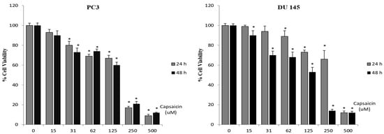 Natural products are widely used in the treatment of cancer due to the side effects of chemotherapeutics, and a large number of natural compounds have been reported to have anticancer activities in different types of cancer. The aim of the study was to analyze the antiproliferative and apoptotic effects of capsaicin and alpha-lipoic acid on prostate cancer cells in silico and in vitro. The effects of capsaicin and alpha-lipoic acid on the proliferation of prostate cancer cells were assessed using MTT cell viability assays. Apoptotic protein levels were measured using Western blot analysis. Ligand–protein potential interactions of alpha-lipoic acid and capsaicin with survivin and bax proteins were examined using CB-Dock2 and SwissDock software. Capsaicin and alpha-lipoic acid significantly inhibited the proliferation of both prostate cancer cell lines in a dose- and time-dependent manner. Our data revealed that various concentrations of capsaicin, alpha-lipoic acid and their combinations caused remarkable downregulation of survivin expression on prostate cancer cells. According to the Vina scores, alpha-lipoic acid and capsaicin have the potential to interact strongly with survivin and bax proteins. We suggest that both natural compounds have the potential for treating prostate cancer according to the in vitro and in silico results.