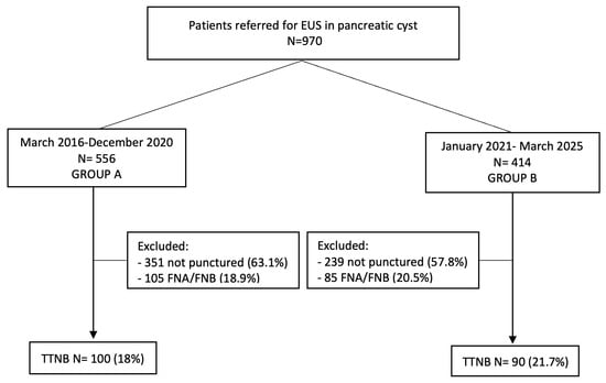 Background/Objectives: Pancreatic cystic lesions (PCLs) are increasingly being detected due to the widespread use of cross-sectional imaging. Endoscopic ultrasound (EUS) is the preferred modality for evaluating their nature and malignancy risk, yet fluid analysis and cytology offer limited sensitivity. Through-the-needle biopsy (TTNB) has emerged as a more accurate diagnostic tool, though it is associated with higher adverse event (AE) rates. In 2021, our center implemented a selective TTNB protocol excluding frail or elderly patients and suspected IPMNs and standardizing the procedure to two passes, complete cyst aspiration, and selective antibiotic prophylaxis. This study aimed to compare AE rates before and after protocol implementation, evaluate safety factors including antibiotic use, and assess TTNB adequacy and diagnostic accuracy. Methods: We retrospectively analyzed consecutive patients referred for TTNB at AOUI Verona between March 2016 and March 2025, dividing them into two groups: before (Group A) and after (Group B) protocol adoption. Patients not punctured due to technical issues, lack of indication, or presumed pseudocystic nature were excluded. Results: Of 970 patients evaluated by EUS, 190 underwent TTNB (100 in Group A and 90 in Group B). Lesions were mainly located in the pancreatic body or tail, with a significantly larger size in Group B. The overall AE rate was 6.3%, significantly higher in Group A (11%) than in Group B (1%). Antibiotic prophylaxis was not associated with AE occurrence. TTNB adequacy was 88.9%, and diagnostic accuracy was 75.3%. Among 68 surgical cases, TTNB was accurate in 79.4%. Conclusions: A selective and standardized TTNB approach significantly reduces AEs while maintaining high adequacy and diagnostic accuracy.