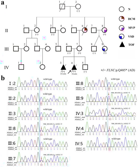 Background and Clinical Significance: FLNC encodes filamin C, a muscle-scaffolding protein crucial for cardiac integrity. Pathogenic FLNC variants cause diverse cardiomyopathies (hypertrophic, dilated, restrictive, and arrhythmogenic) and myofibrillar myopathies, but their role in congenital cardiac malformations is unclear. Notably, FLNC has not been implicated in structural defects such as Tetralogy of Fallot (TOF) to date. Case Presentation: Two fetuses from the same family were prenatally diagnosed with TOF via ultrasound. The trio whole-exome sequencing of the second fetus and her parents identified a novel heterozygous truncating FLNC variant (NM_001458.5:c.1453C>T, p.Q485*). Sanger sequencing confirmed the same variant in the earlier TOF fetus. The mother carried the variant but was asymptomatic. In vitro mutagenesis in rat cardiomyocytes showed that the mutant FLNC construct produced markedly reduced FLNC proteins compared to the wild type and did not form abnormal cytoplasmic aggregates. Conclusions: We report on a novel FLNC truncating variant associated with fetal TOF, extending the spectrum of FLNC-related cardiac anomalies. The variable outcomes among variant carriers—from fetal TOF to adult cardiomyopathy or no clinical manifestations—underscore the complex genotype–phenotype correlations of filaminopathy. This case highlights the importance of comprehensive genetic evaluation in families with diverse cardiac phenotypes and suggests that additional genetic factors likely influence phenotypic expression.