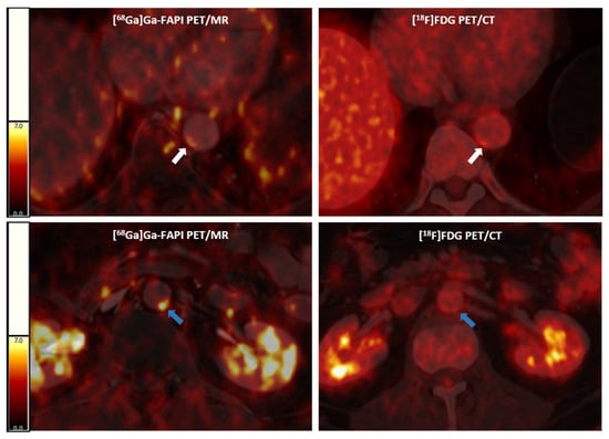 Background: Cardiovascular disease (CVD), driven primarily by atherosclerosis, is a major cause of morbidity and mortality among cancer patients. This study aims to evaluate the diagnostic value of [68Ga]Ga-FAPI-PET as a novel molecular imaging tool for atherosclerosis, compared with established, non-specific [18F]FDG. Methods: We retrospectively analyzed twenty patients with bladder cancer who underwent [68Ga]Ga-FAPI positron-emission tomography/magnetic resonance (PET/MR) and [18F]FDG positron emission tomography/computed tomography (PET/CT) at staging. The target-to-background ratio (TBRs) of both tracers were assessed along six arterial segments, and uptake patterns were compared between the two radiotracers. Additionally, associations between the intensity of PET-active lesions and certain CVD risk factors, as well as the intake of acetylsalicylic acid (ASA), were evaluated. Results: [68Ga]Ga-FAPI detects significantly more active arterial PET lesions and shows significantly higher uptake than [18F]FDG in the per-lesion analysis (TBRFAPI: 1.7 ± 0.5 vs. TBRFDG: 1.4 ± 0.2; difference 19%; p < 0.001) and in the patient-based analysis (TBRFAPI: 1.7 ± 0.4 vs. TBRFDG: 1.4 ± 0.2; difference 19%; p = 0.018). Arterial hypertension (p < 0.001), dyslipidemia (p < 0.001), and particularly type 2 diabetes mellitus (p < 0.001; difference 34%), were significantly associated with elevated [68Ga]Ga-FAPI expression compared to [18F]FDG uptake. ASA therapy was associated with a significant reduction in arterial [68Ga]Ga-FAPI expression than [18F]FDG (p = 0.02). Conclusions: [68Ga]Ga-FAPI-PET imaging, demonstrating superior detection of atherosclerotic activity compared to [18F]FDG, might be a promising molecular imaging marker for atherosclerosis.