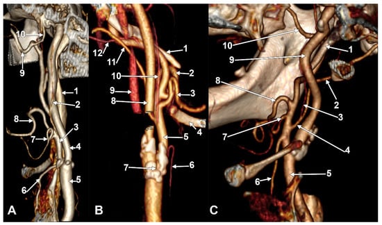 Background/Objectives: The ascending pharyngeal artery (APA) exhibits considerable variability in origin. Understanding its anatomy is essential for head and neck surgery, endovascular procedures, and skull base approaches. This study aimed to (1) systematically characterize APA origin sites, (2) evaluate bilateral patterns, and (3)