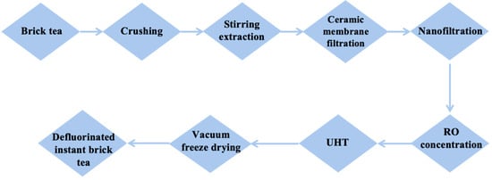 Brick tea is a type of post-fermented food that involves microorganisms. Long-term consumption of brick tea exposes consumers to high fluoride levels, which can adversely affect their health. This study explored the feasibility of selective defluorination of Qingzhuan brick tea through membrane separation technology, and pilot production was conducted to produce defluorinated instant brick tea. The concentration of tea polyphenols increased by more than 10 times after nanofiltration, demonstrating the high selectivity of nanofiltration membranes toward fluoride. Defluorination trends were studied at different initial material concentrations (0.5–4%) and operating pressures (0.1–0.5 MPa) under cyclic defluorination. Defluorinated instant brick tea products were also industrially prepared using 300- (DF-300) and 1000-Da (DF-1000) membranes, followed by vacuum freeze-drying. The DF-1000 and DF-300 products exhibited a defluorination rate of 51.46% and 67.96%, respectively. The products have excellent characteristics in terms of color, aroma, and flavor quality, as well as solubility. Gas chromatography–mass spectrometry indicated that the volatile components in the defluorinated instant brick tea were slightly different from those in the original tea, but the key aroma and flavor characteristics of the defluorinated brick tea remained unchanged. Membrane separation provides technical support for the large-scale production of low-fluoride post-fermented tea.