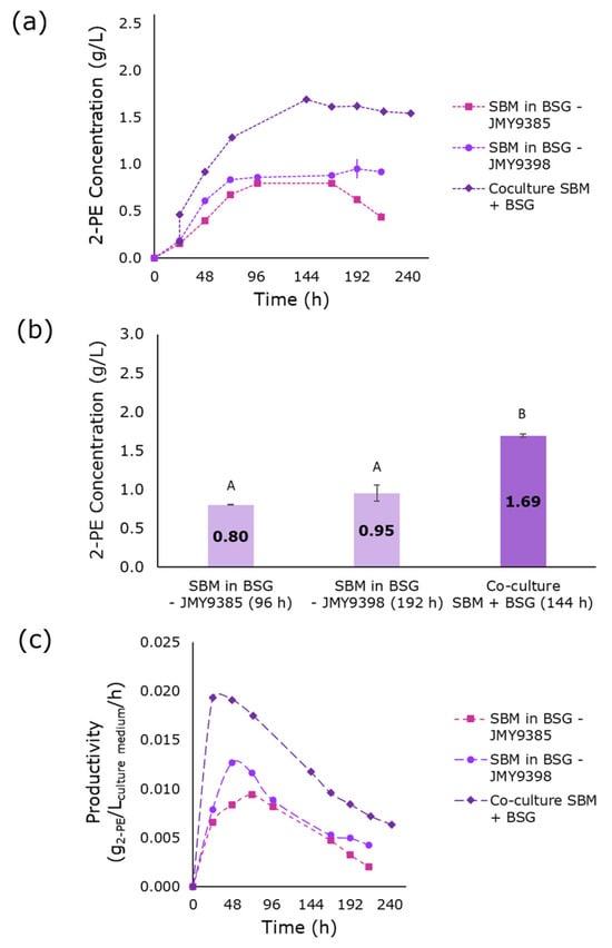 The bioproduction of 2-phenylethanol (2-PE), a high-value aromatic compound widely used in the fragrance, cosmetic, food and beverage, and pharmaceutical industries, through yeast fermentation offers a sustainable alternative to chemical synthesis and rose extraction. This study explores the fermentation of Yarrowia lipolytica strains using mixed agro-industrial by-products as substrates to produce 2-PE via de novo synthesis, without supplementation with the costly precursor L-phenylalanine. Y. lipolytica strains were genetically engineered to enhance flux through the shikimate pathway and enable the hydrolysis of a broader range of substrates. The culture media consisted solely of a mixture of agro-industrial by-products: sugar beet molasses (SBM), brewer’s spent grain (BSG) pressing extract, and chicory root (CR) pressing extract, serving as the primary carbon and nitrogen sources without the addition of nutrients, minerals, synthetic, complex ingredients, or costly additives. The co-culture approach enhanced substrate utilization, leading to an increase in 2-PE titers, reaching approximately 2.5 g/L 2-PE production after 240 h of fermentation. This study demonstrates the feasibility of integrating co-culture fermentation and agro-industrial waste valorization for sustainable 2-PE production, offering a scalable bioprocess for industrial applications.