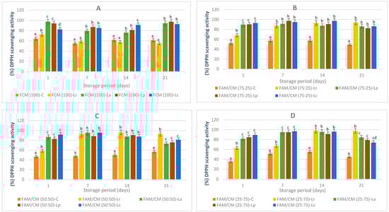 Lactobacilli are important probiotic groups recognized for their numerous health-promoting properties. This study investigated how four probiotic strains, Lacticaseibacillus rhamnosus (Lr), Lactobacillus acidophilus (La), Lactiplantibacillus plantarum (Lp), or Lacticaseibacillus casei (Lc), affected post-acidification, viable cell counts (VCCs), total phenolic and flavonoid contents (TPCs