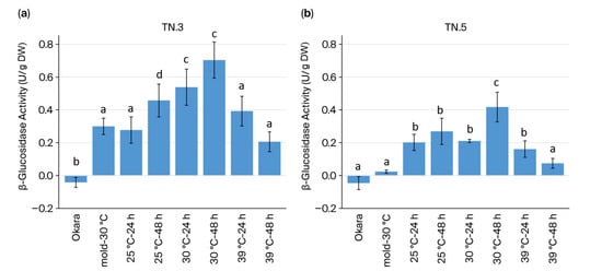 Okara, the soybean residue generated during soymilk and tofu production, is nutrient-rich but underutilized due to its high moisture content and perishability. This study established a sustainable solid-state co-fermentation strategy using Rhizopus oligosporus (BCRC 31631) and Yarrowia lipolytica (BCRC 21252) to enhance the bioactive value of black soybean okara from two Taiwanese cultivars—Tainan No. 3 (TN.3) and Tainan No. 5 (TN.5). Co-fermentation markedly enhanced β-glucosidase activity, reaching 0.75 U/g DW at 30 °C after 48 h in TN.3 and 0.68 U/g DW after 24 h in TN.5, approximately 3.5-fold higher than single-strain fermentation. Near-complete (97–100%) hydrolysis of daidzin, glycitin, and genistin occurred within 24–48 h, producing 672.9 µg/g DM of total aglycone-type isoflavones—an ~11-fold increase compared with unfermented okara (61.5 µg/g DM), where most isoflavones (~740 µg/g DM) remained glycosylated. Varietal structure affected conversion efficiency: TN.3 exhibited stronger enzymatic responsiveness and higher aglycone yield, whereas TN.5 showed faster but less extensive transformation. The process also revealed a bioactive–pigment trade-off, as enhanced isoflavone activation coincided with anthocyanin degradation. These findings demonstrate that ambient-temperature solid-state co-fermentation effectively boosts β-glucosidase activity and isoflavone bioconversion, transforming low-value okara into a high-value functional ingredient consistent with circular bioeconomy and sustainable food system goals.