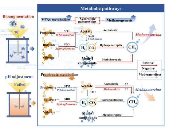 High organic loading is known to destabilize anaerobic digestion (AD). This study compared bioaugmentation and pH adjustment under increasing organic loading rate (OLR: 2.0, 4.0 and 6.0 gVS L−1 d−1), focusing on the responses of microbial structure, metabolic pathways, and energy metabolism. Results demonstrated that bioaugmentation maintained stable methane production of 400.54 ± 10.08 and 374.15 ± 24.32 mL·g-VS−1 at 4.0 and 6.0 gVS L−1 d−1, respectively, whereas control and pH-adjusted reactors failed at 4.0 gVS L−1 d−1. The acidified system restored methane yield from 86.30 to 382.13 mL·g-VS−1 after bioaugmentation, whereas pH adjustment and feeding cessation were ineffective, failing to produce methane within 25 days. Microbial analysis showed bioaugmentation enriched Methanosarcina, enhanced hydrogenotrophic/methylotrophic methanogenesis, and strengthened syntrophy with syntrophic propionate-oxidizing bacteria (SPOB), reducing volatile fatty acid accumulation via reinforced syntrophic propionate/butyrate oxidation. Upregulation of osmoregulatory (nha, kdp, proP) and energy metabolism genes (eha, mvh, hdr) maintained osmotic balance and energy supply under high load. In contrast, pH adjustment downregulated SPOB and propionate oxidation genes, causing persistent acid inhibition. This study elucidated the distinct regulatory effects of bioaugmentation and pH adjustment on high-load AD systems, providing actionable strategies for both maintaining operational stability in high-load reactors and recovering methanogenesis in acid-inhibited systems.
