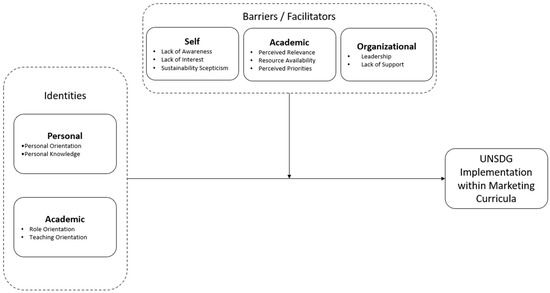 Achieving the United Nations Sustainable Development Goals (UNSDGs) is considered to be imperative for the future security and sustainability of the world. Universities are viewed as being a key industry to support the achievement of the goals by the target date of 2030. Previous research undertaken has attempted to understand how the goals can be successfully implemented within the university curricula, and although various processes for implementation have been suggested, no previous studies have examined the role of identity or the impact that this may have on the implementation of the UNSDGs. In this study, specific attention has been applied to the existing literature relating to the barriers to implementation, the role of identity, and the impact on implementation to understand the roles that personal, academic, and organizational identities play when implementing UNSDGs within higher education. The research undertaken has employed a qualitative inductive approach focused specifically upon the marketing curriculum. Semi-structured interviews were conducted with the academics working at UK higher education institutions. Findings from the thematic analysis undertaken found that there is a complex interchange between these identities that significantly influences the extent to which the goals have been implemented successfully. In addition, multiple barriers have been identified that prevent successful implementation of the goals.