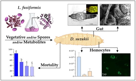 The increase in the world population and consequent rise in food demand have led to the extensive use of chemical pesticides, causing environmental and health concerns. In response, biological control methods, particularly those involving microbial agents, have emerged as sustainable alternatives within integrated pest management. This study highlights the potential of Lysinibacillus fusiformis as a biocontrol agent against the dipteran Drosophila suzukii (Matsumura) (Diptera: Drosophilidae), a pest responsible for damaging soft-skinned fruits. Experimental treatments using vegetative cells, spores, and secondary metabolites of L. fusiformis on D. suzukii larvae demonstrated significant larvicidal effects, accompanied by observable changes in gut morphology under microscopy. Moreover, preliminary immunological assays showed the interference of this bacterium with the host immune system. All the results indicate the suitability of L. fusiformis for its possible integration into sustainable agricultural practices, although additional research is required to understand its applicability in the field.