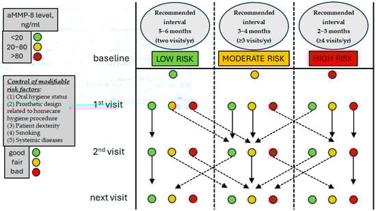 Dental implants are a popular clinical procedure for the rehabilitation of fully and partially ede ntulous patients. There is long-term evidence that implant-supported dental prostheses represent a predictable treatment for replacing missing teeth. However, several types of complications may arise, which can compromise implant treatment outcome. Peri-implant disease is a growing biological complication, consisting of a progressive loss of supporting bone, associated with microbial biofilm and clinical inflammation. It represents a concern for clinicians and patients, having a negative impact on quality of life. This narrative review aimed at summarize the current knowledge on etiology, epidemiology, risk factors, and pathogenesis of peri-implant disease. It also focused on the diagnostic potential of active matrix metalloproteinase-8 (aMMP-8) in peri-implant sulcular fluid for assessing the status of peri-implant tissues and the risk of developing peri-implantitis. A literature search was conducted in PubMed and Scopus databases using search terms like: peri-implantitis, peri-implant biomarkers, aMMP-8, implant maintenance, risk assessment. Clinical studies, systematic reviews, meta-analysis and consensus papers published up to June 2025 were considered. Finally, based on the main factors involved in the onset and progression of peri-implant disease, a new protocol was conceived for determining the optimal implant maintenance scheduling for individual patients. The Biomarker-Guided Implant Maintenance (BGIM) protocol considers a few key parameters, among which aMMP-8 level, and proposes three categories associated with different levels of risk for peri-implantitis. The higher the risk, the more frequently a patient should undergo professional maintenance, to prevent peri-implant disease, with potential favorable effects on implant longevity. The proposed BGIM protocol, that requires prospective validation, represents a structured and clinically applicable biomarker-driven framework for individualizing implant maintenance scheduling by integrating real-time chairside quantification of aMMP-8 with established patient-related risk factors.