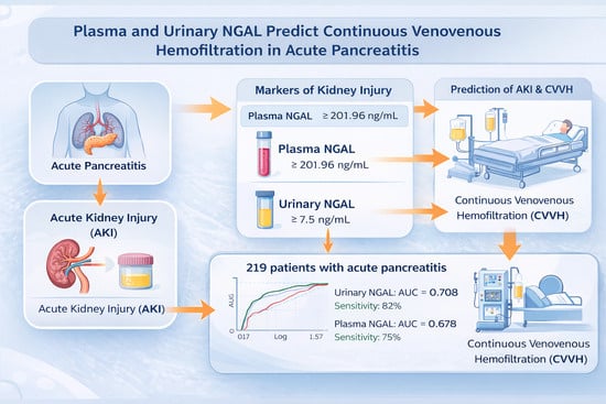 Background: Acute kidney injury (AKI) is a serious complication of acute pancreatitis and is frequently associated with the need for continuous renal replacement therapy. Early identification of patients at risk of requiring continuous venovenous hemofiltration (CVVHF) remains challenging because conventional renal markers often reflect delayed kidney injury. Neutrophil gelatinase-associated lipocalin (NGAL) has emerged as a potential biomarker of early renal tubular damage. Methods: This observational study included 219 patients with acute pancreatitis. Plasma and urinary NGAL levels were measured at hospital admission. Clinical characteristics, laboratory parameters, and severity scores were compared between patients who required CVVHF and those who did not. Multivariate logistic regression analysis was performed to identify factors associated with CVVHF requirement, and predictive performance was evaluated using receiver operating characteristic (ROC) curve analysis. Results: During hospitalization, 28 patients (12.8%) required CVVHF and had significantly more severe disease. Both plasma and urinary NGAL levels were higher in patients requiring CVVHF. In multivariate analysis, urinary NGAL remained independently associated with CVVHF requirement. ROC analysis demonstrated moderate predictive performance for urinary NGAL (AUC 0.708). Conclusions: Urinary NGAL was independently associated with the requirement for CVVHF and demonstrated moderate predictive performance. These findings suggest that urinary NGAL may provide kidney-specific information and improve early risk stratification beyond conventional clinical parameters.