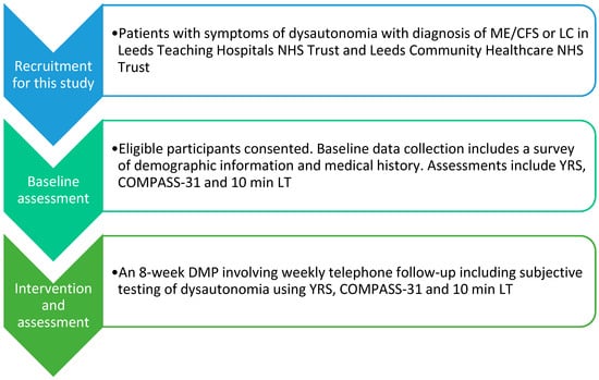 Background/Objectives: Myalgic Encephalomyelitis/Chronic Fatigue Syndrome (ME/CFS) and Long COVID (LC) are complex multisystem conditions with significant functional disability. Many patients experience symptoms of orthostatic intolerance, which can be captured in some cases as Orthostatic Hypotension (OH) or Postural orthostatic Tachycardia Syndrome (PoTS) on objective testing. Conservative treatments are recommended for first-line symptom management, but there is a lack of efficacy evidence. This study aims to assess the feasibility of an 8-week clinically supervised, personalised Dysautonomia Management Protocol (DMP) in a cohort of ME/CFS and LC patients with subjective and objective evidence of orthostatic intolerance (dysautonomia). Methods: ME/CFS and LC patients with objective dysautonomia on the 10 min active Lean Test (LT) were recruited to an 8-week DMP, with interventions introduced cumulatively every two weeks. Interventions included increasing daily fluid intake to 3 litres and salt intake to 10 g, pacing to avoid crashes and calf activation. Baseline and weekly data collection included the LT, Composite Autonomic Symptom Score questionnaire (COMPASS-31) and Yorkshire Rehabilitation Scale (YRS). Results: Sixteen participants completed the 8-week program, five discontinued during the program, and one was withdrawn following a severe crash. The COMPASS-31 improved by 7.7 points from week 1 to week 8 (p = 0.045), with a medium Cohen’s d effect size of 0.55. For the same period, there was a non-significant (p = 0.16) improvement in the YRS symptom severity score by 2 points. Comparing the final two weeks of the program with the first two weeks, mean heart rate during the LT decreased by 4.8 beats per minute (p = 0.032), with a medium Cohen’s d effect size of 0.44. Adherence to the interventions was highly variable, with none of the patients able to fully employ all four recommendations. Conclusions: The results suggest that targeted conservative interventions could influence autonomic function and symptom reduction. However, the magnitude of change was limited, and statistical significance might not necessarily relate to a clinically significant improvement in symptoms.