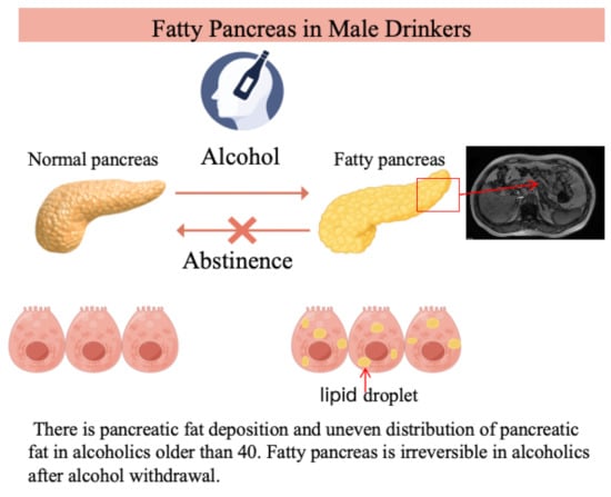 Background: Chronic alcohol consumption is a recognized cause of pancreatic steatosis, though its imaging characteristics in individuals remain undefined. This study investigated the effect of chronic alcohol intake on the pancreatic fat content and distribution in a male population and assessed the impact of abstinence. Methods: In this cross-sectional study, 140 male alcohol drinkers (who consumed >20 g ethanol/day for >5 years) and 142 male non-drinkers were recruited. The pancreatic fat fraction (FF) was quantified using T1- and T2*-corrected double-echo chemical shift magnetic resonance imaging (CSI). Participants were stratified by age (20–50 years, 50–70 years). Drinkers were further categorized as current drinkers or short-term (<1 year) or long-term (1–2 years) abstainers. Results: The pancreatic FF was significantly higher in alcohol drinkers compared with age-matched controls in the 20–50-year-old (6.07 ± 1.59% vs. 2.94 ± 0.62%, p < 0.05) and 50–70-year-old (9.14 ± 2.22% vs. 5.98 ± 1.00%, p < 0.05) groups. In drinkers aged 40–70 years, the pancreatic fat distribution was uneven. No significant difference in the FF was observed across the three drinking status groups (p > 0.05). Conclusions: Chronic alcohol consumption could cause fat deposition in the pancreas. An uneven distribution of pancreatic fat began in the fourth decade in this male population. An alcoholic fatty pancreas was not reversed within a follow-up period of up to two years.
