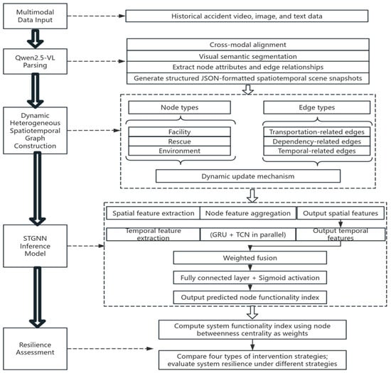 Ports face critical security threats from hazardous cargo misdeclaration, which poses unique challenges due to its high concealment and catastrophic potential, as exemplified by the Beirut Port explosion. Traditional resilience assessment approaches relying on hazard state transition probabilities require abundant historical data or extensive domain expertise for probability elicitation, and static indicator-based assessment frameworks fail to capture the spatiotemporal evolution characteristics of disasters. To address these challenges, this study proposes a hybrid framework that leverages the Large Language Model (LLM)’s generalizable world knowledge for data augmentation while developing a Spatiotemporal Graph Neural Network (STGNN) to predict dynamic disaster propagation. Specifically, a multimodal LLM is employed to extract structured port state descriptions from temporally aligned disaster data and infer the states at undocumented time steps. With more disaster scenarios adapted from the real cases using the LLM, a STGNN is trained to learn the disaster evolution dynamics and make efficient real-time inference for resilience assessment and intervention strategy evaluation. Validation on Tianjin and Beirut Port incidents demonstrates that the framework accurately predicts disaster propagation pathways and identifies critical intervention priorities. It also reveals that topology-based intervention strategies substantially accelerate recovery, while adverse environmental conditions significantly amplify cumulative functional loss. This study represents an advancement toward AI-driven resilience modeling, offering port operators and regulators an adaptable, scalable decision support tool for intelligent safety governance.