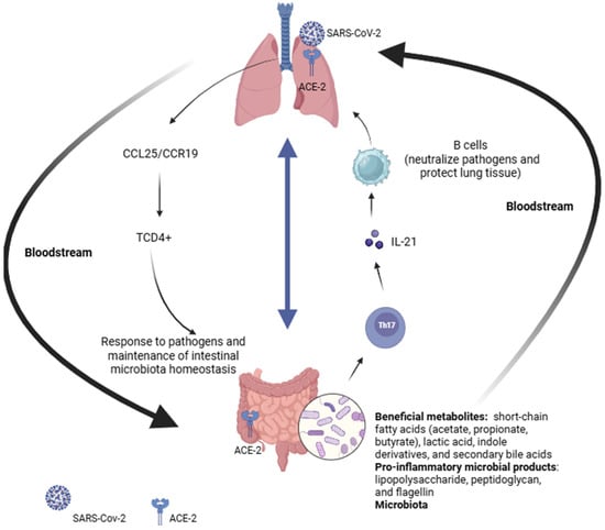 COVID-19 can cause long-term symptoms, such as a post-infection syndrome, known as Long-COVID. Among the symptoms present during this period, the most reported are gastrointestinal symptoms. This study discusses the effects of changes in the gut microbiota of post-COVID-19 patients. SARS-CoV-2 infection is associated with significant alterations in gut microbial composition, disturbing its homeostasis and promoting a reduction in the abundance of beneficial symbiotic bacteria and an increase in the abundance of opportunistic pathogens. Furthermore, the composition of the gut microbiota may play a role in the prognosis of patients with post-COVID-19 infection. The microbiota of the intestinal tract and the respiratory tract influence each other; therefore, the gut–lung axis has attracted increasing interest in understanding COVID-19. Moreover, the brain–gut axis has been studied, since there have been reports of anxiety and depression along with post-COVID-19 gastrointestinal symptoms. Treatments options for intestinal dysbiosis in Long-COVID patients include probiotics, prebiotics, and fecal microbiota transplantation. These treatments may serve as an approach to improve gastrointestinal symptoms during Long-COVID, increasing microbiome diversity, strengthening the integrity of intestinal barrier functions, and consequently influencing the treatment of COVID-19.