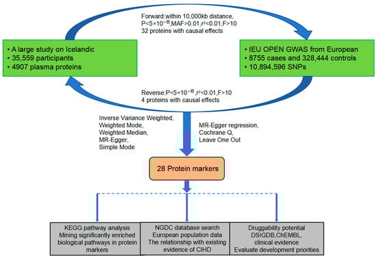 Background: Chronic ischemic heart disease (CIHD) is characterized by persistent myocardial ischemic due to long-term reduced coronary blood flow. In the past, we mainly relied on surgical intervention or drug therapy to alleviate symptoms, but effective targeted treatments were scarce. Proteomics serves as a key tool to identify novel therapeutic targets. Methods: This study performed a bidirectional Mendelian randomization (MR) analysis by integrating genome-wide association study (GWAS) data on CIHD (10,894,596 single-nucleotide polymorphisms) with plasma proteomic data encompassing 4907 proteins. We conducted Kyoto Encyclopedia of Genes and Genomes (KEGG) enrichment analysis to identify pathways linked to candidate protein biomarkers, searched the National Genomics Data Center (NGDC) database for existing evidence of their association with CIHD, and evaluated druggability through multi-dimensional analysis integrating the DSIGDB, ChEMBL, and clinical trial databases. Results: After eliminating the reverse effect, ultimately identifying 28 protein markers, including 16 risk-associated and 12 protective proteins. We also investigated their roles in the pathways related to CIHD. Meanwhile, the search confirmed that five of them were newly discovered protein markers. Ultimately, through evaluation, three priority therapeutic targets (CXCL12, PLAU, CD14) were identified for development. Conclusions: This study identified some biomarkers related to CIHD and analyzed the possible pathways involved. It also provided some new insights into the identification of the target and druggability.