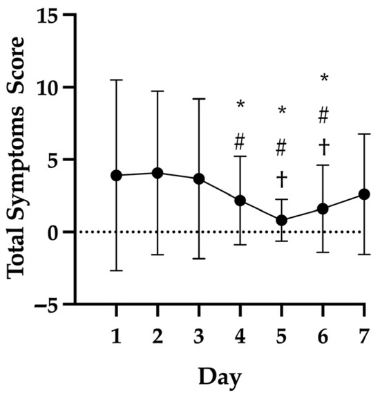 Background: Symptom scales are routinely used in sport during concussion screening and return-to-play. Limited research has explored the presence of concussion symptoms in the absence of a diagnosed concussion. This study analyzed concussion symptom scores in concussed vs. non-concussed football players after football activities and evaluated the effect of field of play variables. Methods: NCAA Division I football players with (n = 9) and without (n = 30) diagnosed concussion completed concussion symptom scales (C3 Logix) following practice for 1 week. Wet bulb globe temperature (WBGT), play duration, equipment, and location (inside/outside) were recorded. Mixed models analyzed the effect of day, WBGT, equipment, location, and play duration on concussion-like symptoms in non-concussed players and determined the time course of symptom relief in concussed players. Results: Fatigue or low energy (27.6%), neck pain (16.8%), feeling slowed down (14.8%), and headache (12.8%) were most reported. In non-concussed players, total symptoms scores were higher early in the week (Monday/Tuesday) and decreased throughout the week (p < 0.01). No effect of play duration (p = 0.49), WBGT (p = 0.12), equipment (p = 0.40), or location (p = 0.83) was found. Symptom scores were greater in the concussed vs. non-concussed groups on days 1–3. Conclusions: Football players report concussion-like symptoms in the absence of a concussion diagnosis, particularly following the first few practices after a game.