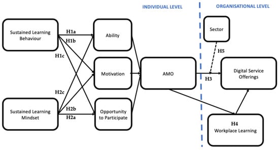 In the context of the digital transformation of healthcare organisations, this study investigates the critical role of sustained learning, employee readiness, and supportive learning conditions to enable digital service offerings. Drawing on dynamic capabilities theory, we conceptualise and empirically test a multilevel model, exploring how sustained learning behaviour and mindset shape the Ability–Motivation–Opportunity (AMO) framework at the individual level. Furthermore, we analyse how workplace learning mediates the relationship between AMO on service outcomes at an organisational level, with sector affiliation as a moderating factor. Data were collected from 856 participants with online surveys and analysed with PLS-SEM. The results confirmed that sustained learning significantly enhances individual readiness (ability, motivation, and opportunity), which in turn positively influences digital services. Workplace learning was found to be a potent mediator, and sector affiliation significantly moderated the relationship between workforce enhancement and digital service outcomes. These findings underline the importance of embedding an employee sustained learning mindset and behaviour as an organisational capability, beyond technical implementation. The results suggest that a successful digital transformation hinges on cognitive and behavioural learning engagement, supported by supportive learning structures and context-specific strategies.