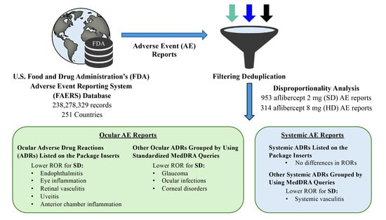 This pharmacovigilance study drew upon the U.S. Food and Drug Administration’s Adverse Event Reporting System (FAERS) database to compare the reporting patterns of ocular and systemic adverse events (AEs) for the 2 mg (standard-dose [SD]) and 8 mg (high-dose [HD]) formulations of aflibercept