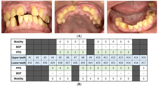 The findings at 77 days after the first visit. (A) These intraoral photos indicate good periodontal condition. (B) Periodontal assessment, including that of tooth mobility (Mobility), bleeding of probing (BOP), and probing pocket depth (PPD) (maximum value on each tooth). Black color boxes indicate missing teeth. A green color box indicates acceptable PPD (not exceeding 3 mm). BOP (−) indicates no bleeding. (C) Panoramic revealed that the alveolar bone resorption had not progressed.