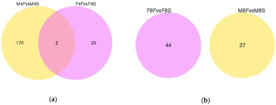 Venn diagram of differentially expressed genes. (a) Venn diagram of differentially expressed genes for four-week old males and females. (b) Venn diagram of differentially expressed genes for eight-week old males and females. (c) Venn diagram of differentially expressed genes for four-week and eight-week-old males. (d) Venn diagram of differentially expressed genes for four-week and eight-week-old females.