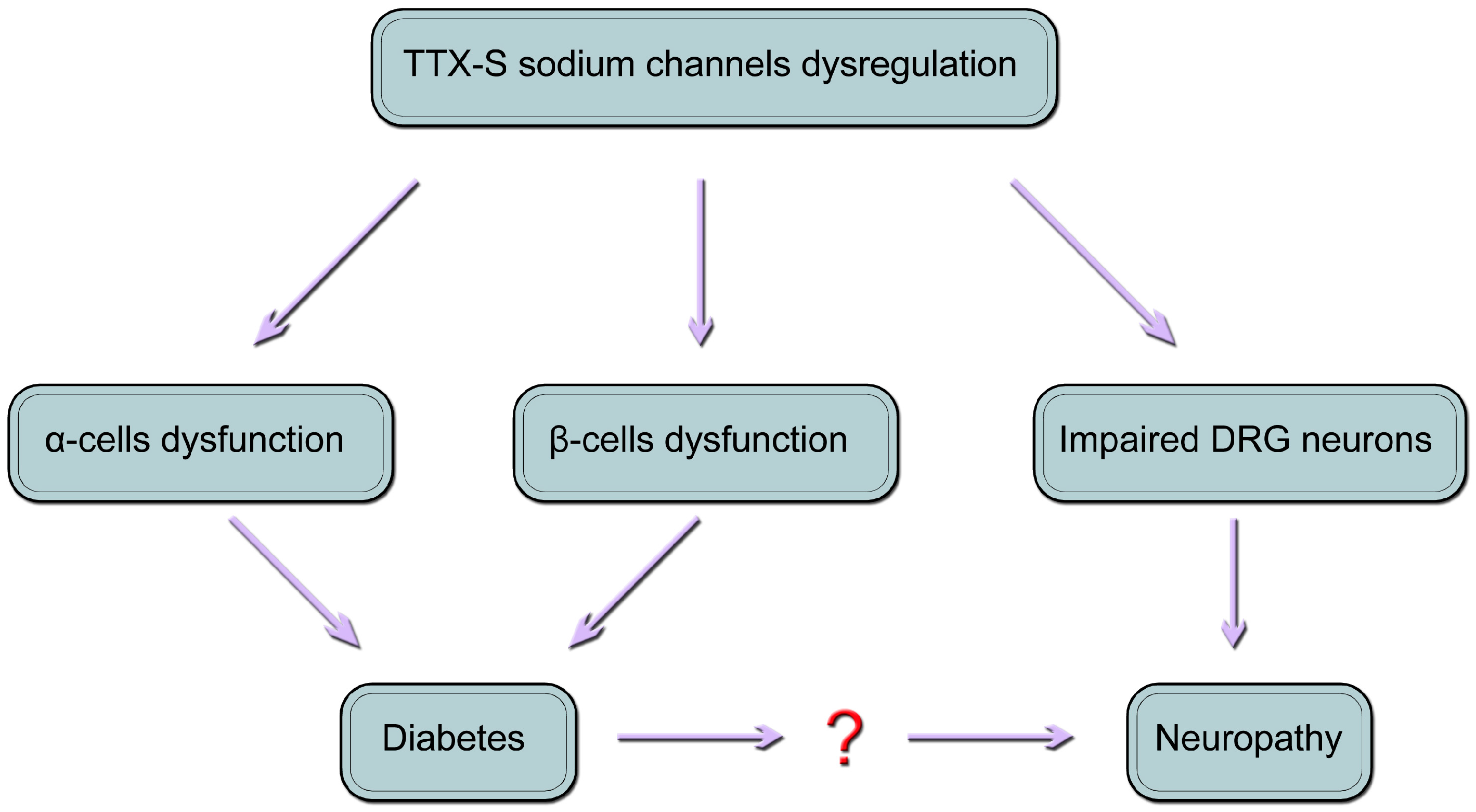 A model of the relationship between diabetes and neuropathy. The dysregulation of tetrodotoxin-sensitive (TTX-S) sodium channels, which are expressed in pancreatic α cells, β cells and dorsal root ganglion (DRG) neurons, leads to diabetes and periphery neuropathy. This model is modified from Hoeijmakers et al. [42].