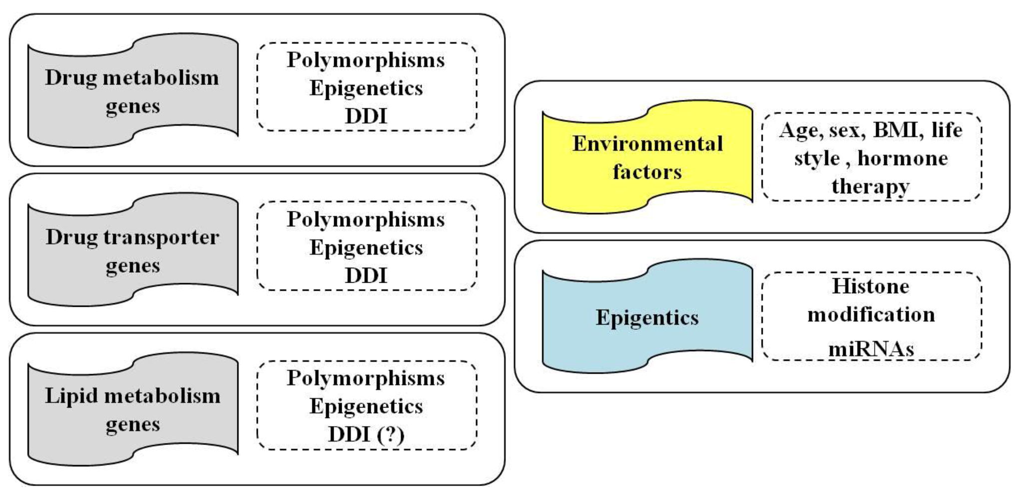 Influence of pharmacogenetics, epigenetics and drug–drug interactions (DDI) on genes involved in drug metabolism, transport and in lipid metabolism (left panels) of statins. Environmental and individual factors, such as age, sex and body mass index (BMI), life style (alcohol and smoking) and hormone therapy, as well as epigenetic modifications (histone modifications and miRNAs), also contribute to the efficacy and/or toxicity of statins treatment (right panels).