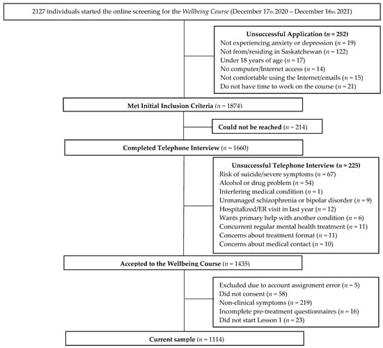 During the recruitment period, 2127 individuals expressed interest and completed an initial assessment, of which 1874 applicants met initial inclusion criteria. The telephone interview was completed by 1660 applicants, and 1435 individuals were accepted into the trial. The current study utilized a subsample of these participants (n = 1114) who reported clinically significant symptoms on the depression or anxiety measure (as defined below), completed pre-treatment questionnaires, and began Lesson 1. Participant flow is provided in Figure 1.