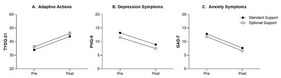 Change in adaptive actions (A), depression symptoms (B), anxiety symptoms (C) from pre-treatment to post-treatment in participants who received standard support and optional support alongside ICBT.