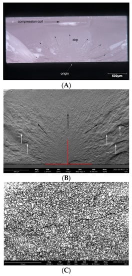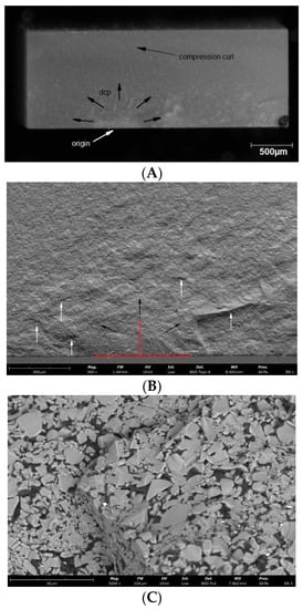 Representative microscopic and SEM images of the fracture surface of the VSC B sample; (A) visible compression curl on top, the direction of crack propagation and the origin on the bottom; (B) Red lines indicate the width and depth of the crack at the fracture origin. Black arrows indicate the direction of crack propagation away from the crack origin, white arrows indicate bending marks on the fracture surface; (C) microcrack spreading along the particle boundaries visible on the enlarged area of figure (B) indicated by the white arrow; (D) microcrack spreading along the particle boundaries visible on the enlarged area of figure (B) indicated by the white arrow.