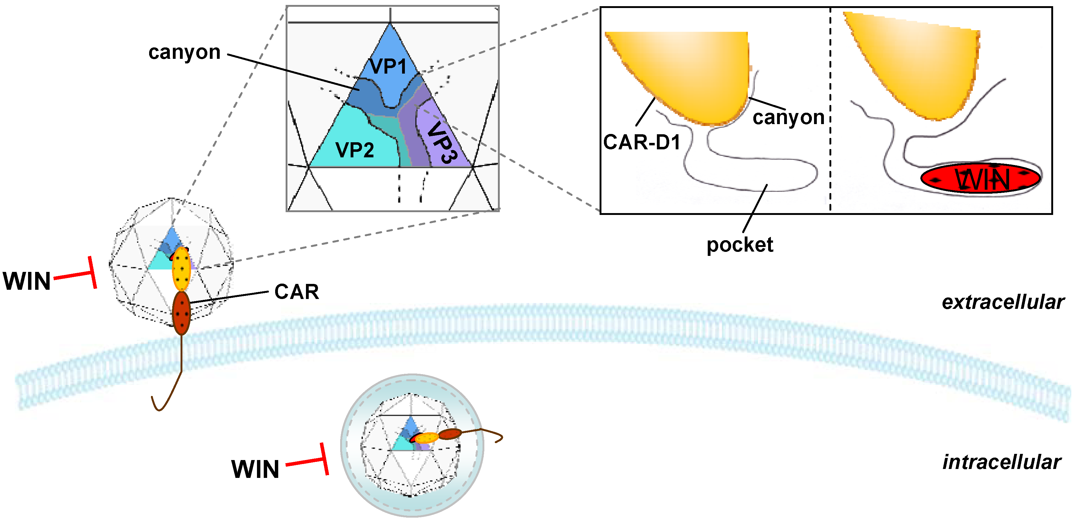 Inhibition of coxsackieviruses by WIN compounds. WIN compounds bind to the canyon pocket of CVB3 thereby inhibiting the binding of the virus to the cellular receptor CAR. WIN compounds also inhibit the uncoating and release of the viral RNA into the cytoplasm.