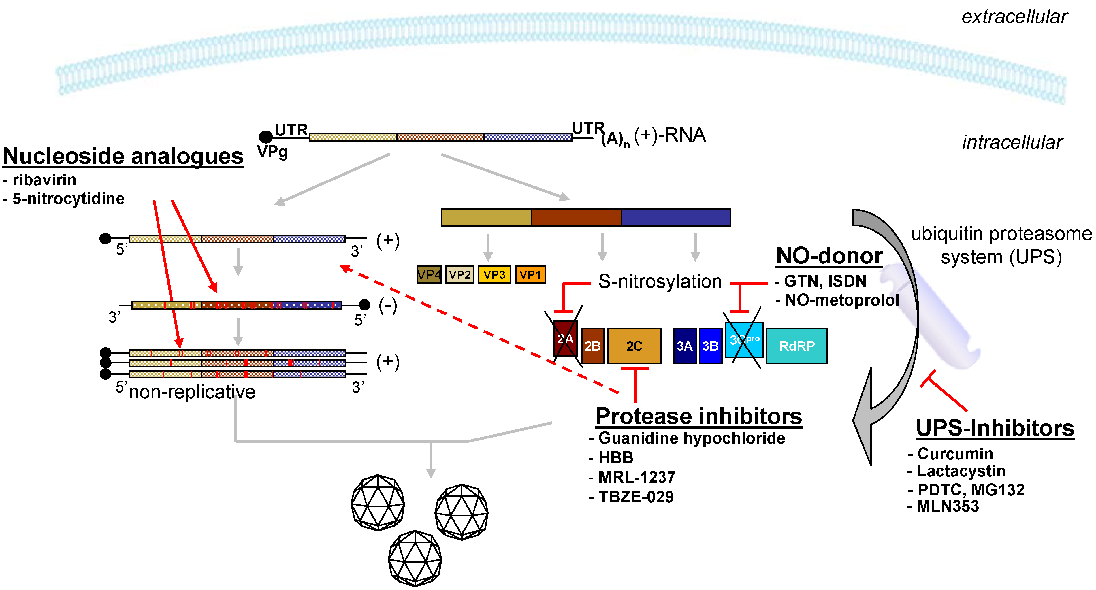 Nitric oxide (NO) donors form another class of molecules which interfere with the functions of viral non-structural proteins (Figure 2). They inhibit enterovirus proteases 2A and 3C by S-nitrosylation [73,74]. Both proteases are involved in host cell shut-off and lead to the development of the cytopathic effects [75,76,77]. The NO donors GTN and ISDN are able to inhibit coxsackievirus proteases and induce a significant antiviral effect in vitro. Furthermore, GTN significantly reduced signs of myocarditis after administration by decreasing immune cell infiltration and virus-induced fibrosis up to day 14 post-infection (p.i.) [78]. In another study the NO-donor was NO-metoprolol, a novel NO-releasing derivative of the β1-selective adrenergic receptor agonist metoprolol. It has been shown that metoprolol improves the survival, remodeling, fibrosis and left ventricular systolic function in a knock-in mouse model for inherited dilated cardiomyopathy [79]. In the CVB3 myocarditis mouse model treatment with NO-metoprolol displays an enhanced therapeutic benefit compared to metoprolol, with significant reduction of viral RNA copy numbers, body weight loss, infiltration and fibrosis score [80].