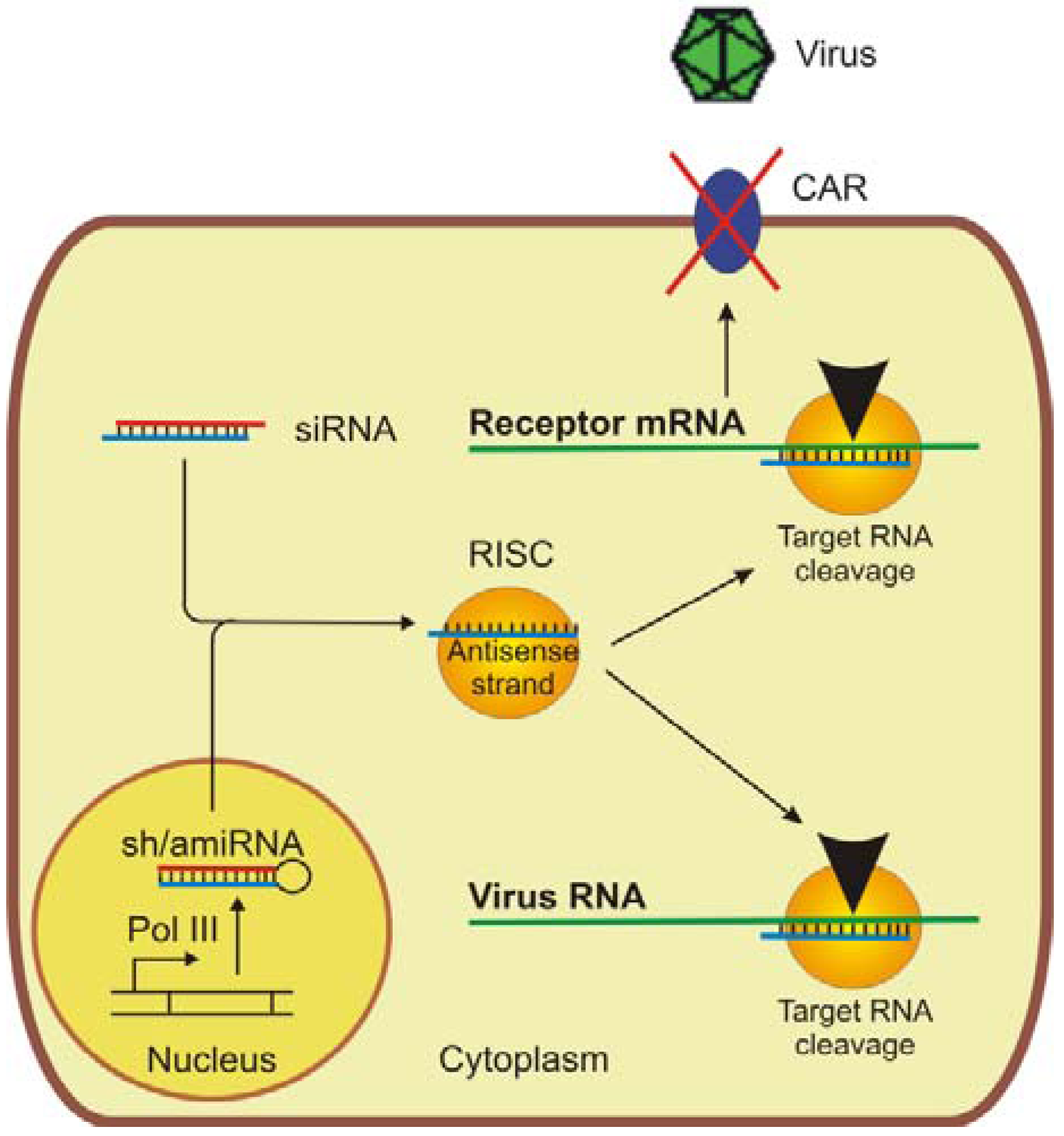 Antiviral applications of RNAi. RNAi can either be induced by chemically synthesized small interfering RNAs (siRNAs) or by vector expressed short hairpin RNAs (shRNAs) or artificial microRNAs (amiRNAs), respectively. The activated RNA-induced silencing complex (RISC) contains only the antisense strand of the double-stranded RNA. The RNAi approach can either be directed against the virus itself or against the virus’s receptor, whose silencing will prevent virus entry into the cell.