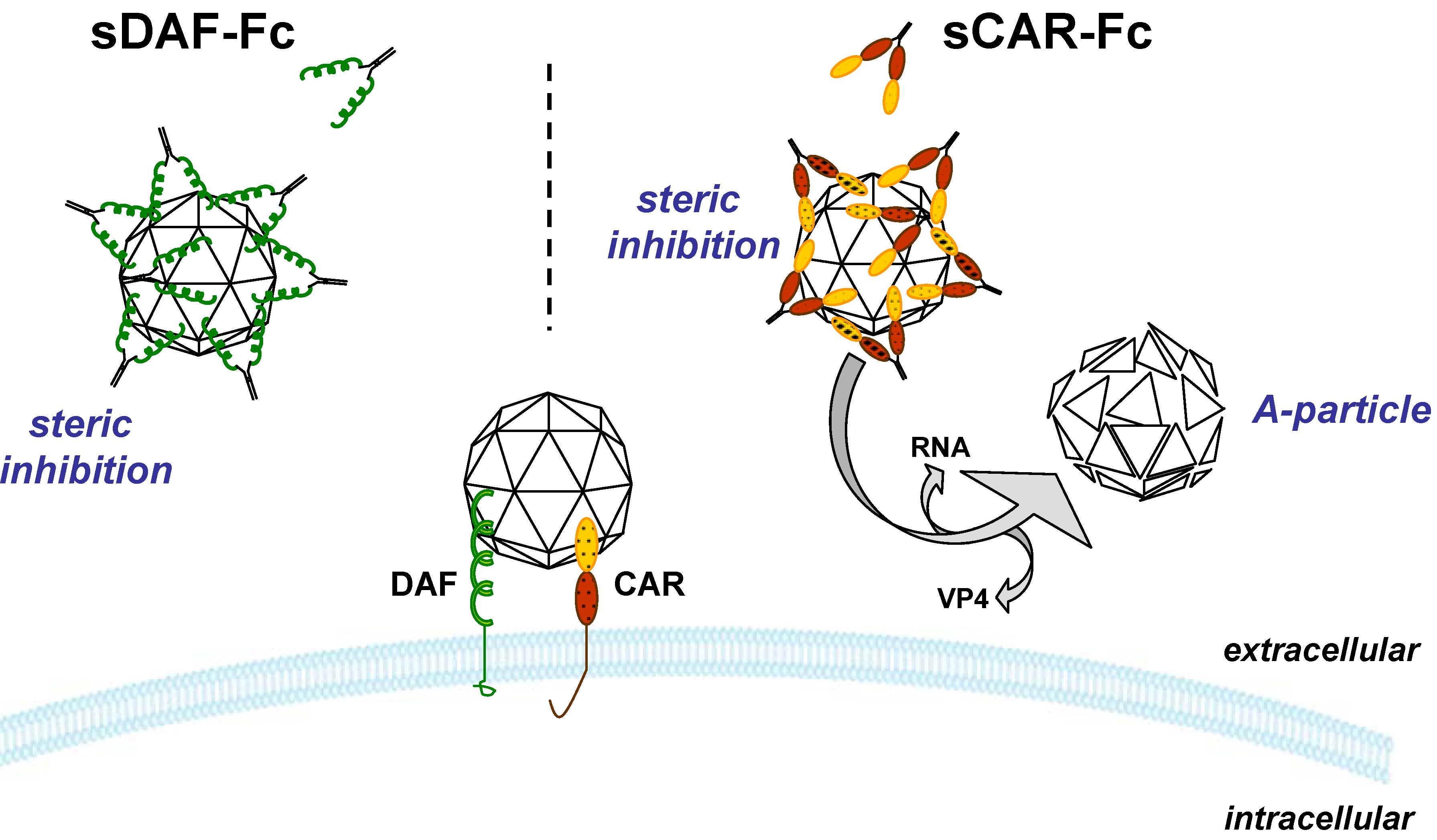 Mechanisms of inhibition of CVB3 by sCAR-Fc and sDAF-Fc. sCAR-Fc and sDAF-Fc bind to the viral capsid. This occupies the virus’s binding site for the receptors, preventing binding, and causes steric problems during the entry or uncoating steps for those which do manage to bind. Additionally, sCAR-Fc induces the formation of altered “A”-particles lacking VP4 and the viral RNA. A-particles are not infectious.