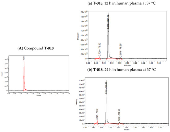 Compounds T-018 and T-069 were selected to analyze their stability in human plasma. A total of 1 mg of each of the two compounds was dissolved in 1 mL of dichlorometane. Then, 0.1 mL was added to 0.9 mL of 0.1% formic acid in acetonitrile for analysis by UPLC with an ACQUITY QDa mass detector from Waters (Milford, MA, USA) under the following conditions: column: ACQUITY UPLC® BEH C18 1.7 µm, 2.1 × 100 mm; mobile phase: 0.1% formic acid/acetonitrile; run time: 5 min; flow rate: 0.3 mL/min; injection volume: 0.5 µL; temperature: 40 °C. After that, 3 mL of human plasma was obtained from a volunteer under medical supervision and following the standard procedures. Then, 1 mg of T-018 and T-069 were dissolved with DMSO 2% and added to 1 mL of human plasma. Samples were incubated at 37 °C for 12 and 24 h. T-018 and T-069 were obtained by liquid extraction with dichloromethane (10 mL) three times and the solvent was eliminated for vacuum pressure. After that, 1 mL of dichlorometane was added and 0.1 mL was added to 0.9 mL of 0.1% formic acid in acetonitrile and analyzed by UPLC-MS. Percentage of degradation was calculated considering the area under the curve of each peak/the area under the curve of all peaks × 100% at 24 h only.