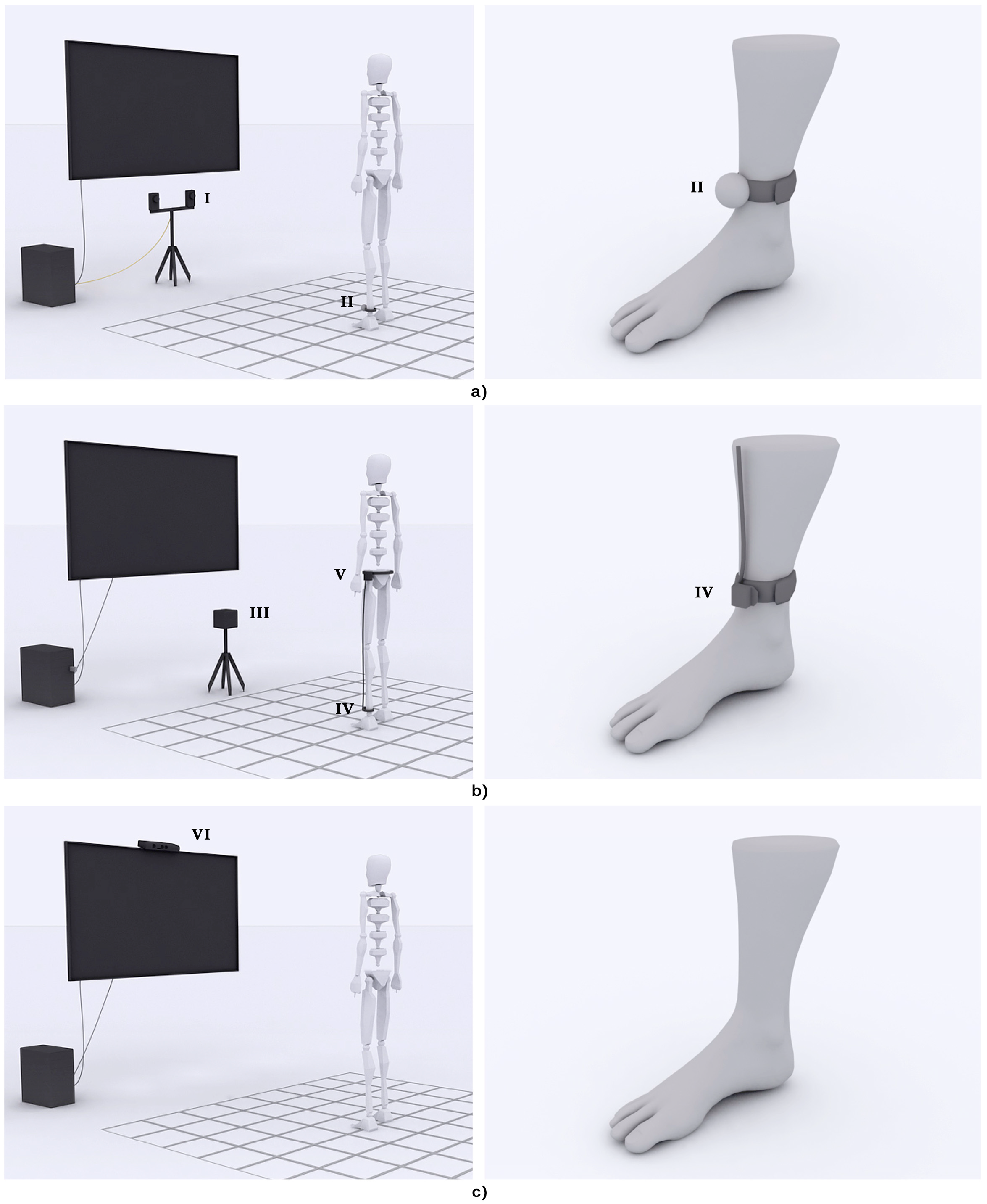 Setting of the tracking systems. Three different tracking systems were tested in the study. (a) The optical tracking solution used two cameras (I) and a passive reflective marker (II); (b) The electromagnetic tracking solution used a source (III) and a sensor (IV), wire connected to a hub (V); (c) The skeleton tracking solution used a depth sensor (VI).