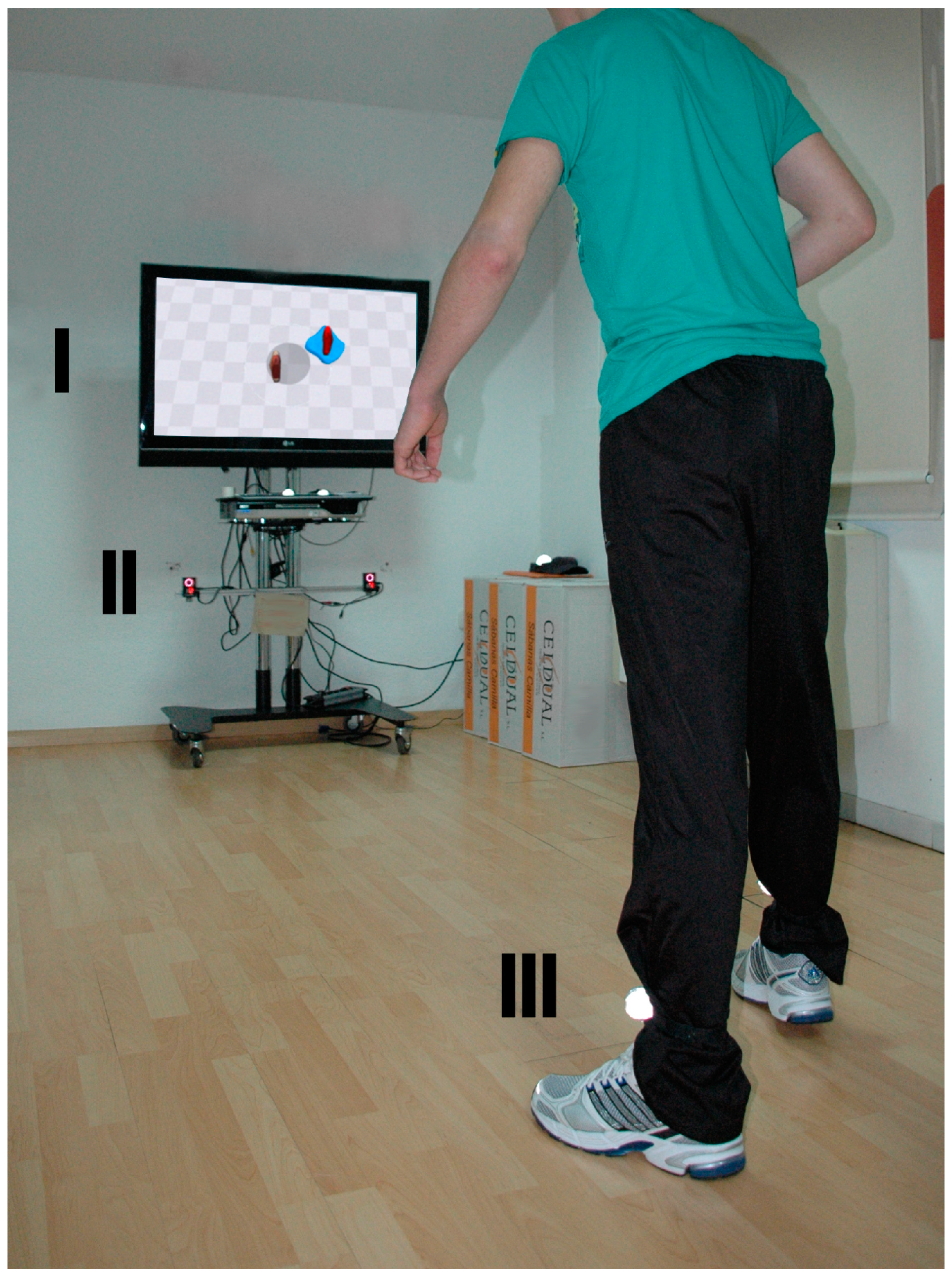 Participant interacting with the virtual rehabilitation system. The participant’s movements are tracked by two infrared cameras (II), which estimate the position of reflective markers attached to their ankles (III). The position of the markers are then transferred to the virtual environment, shown in a TV screen (I).