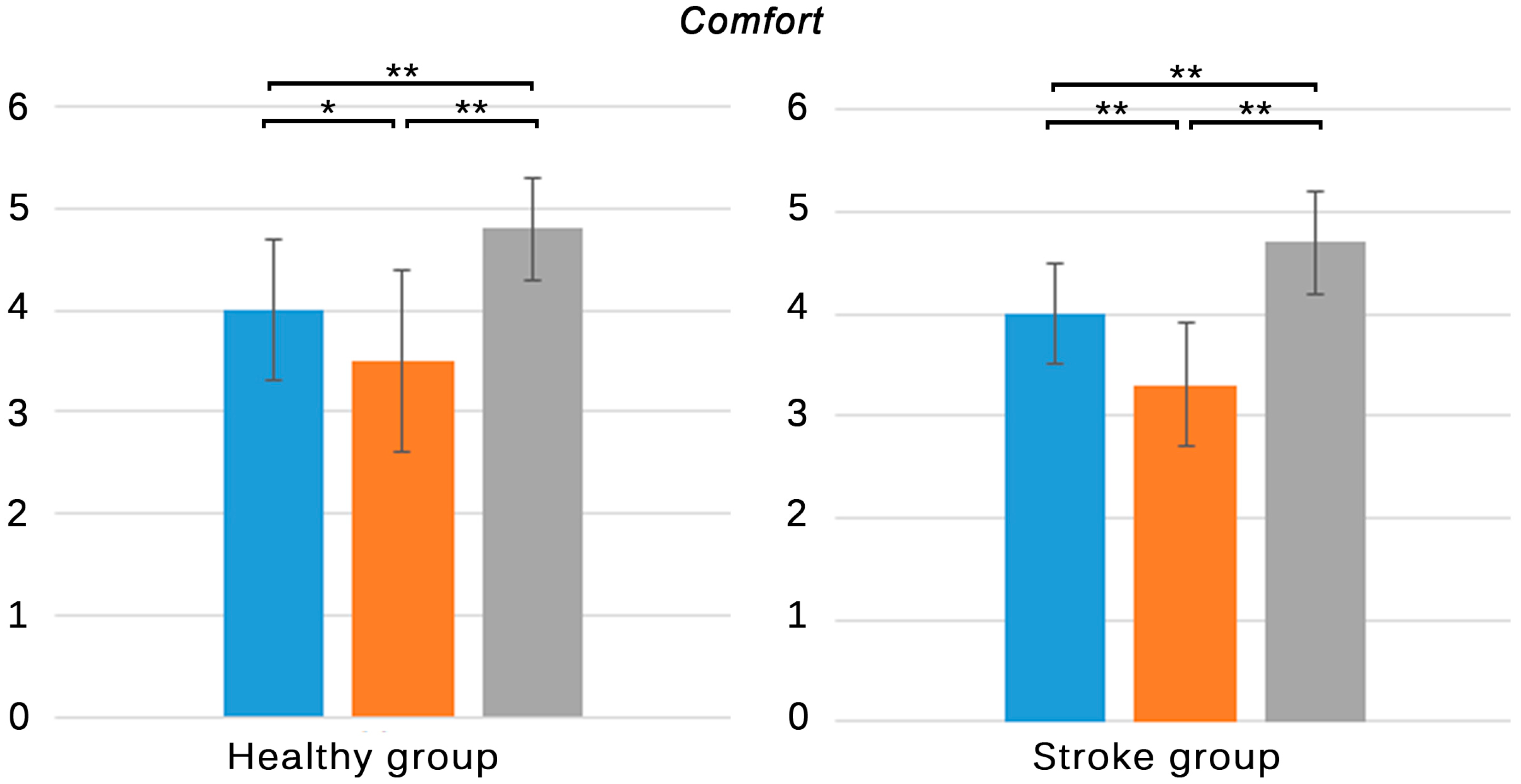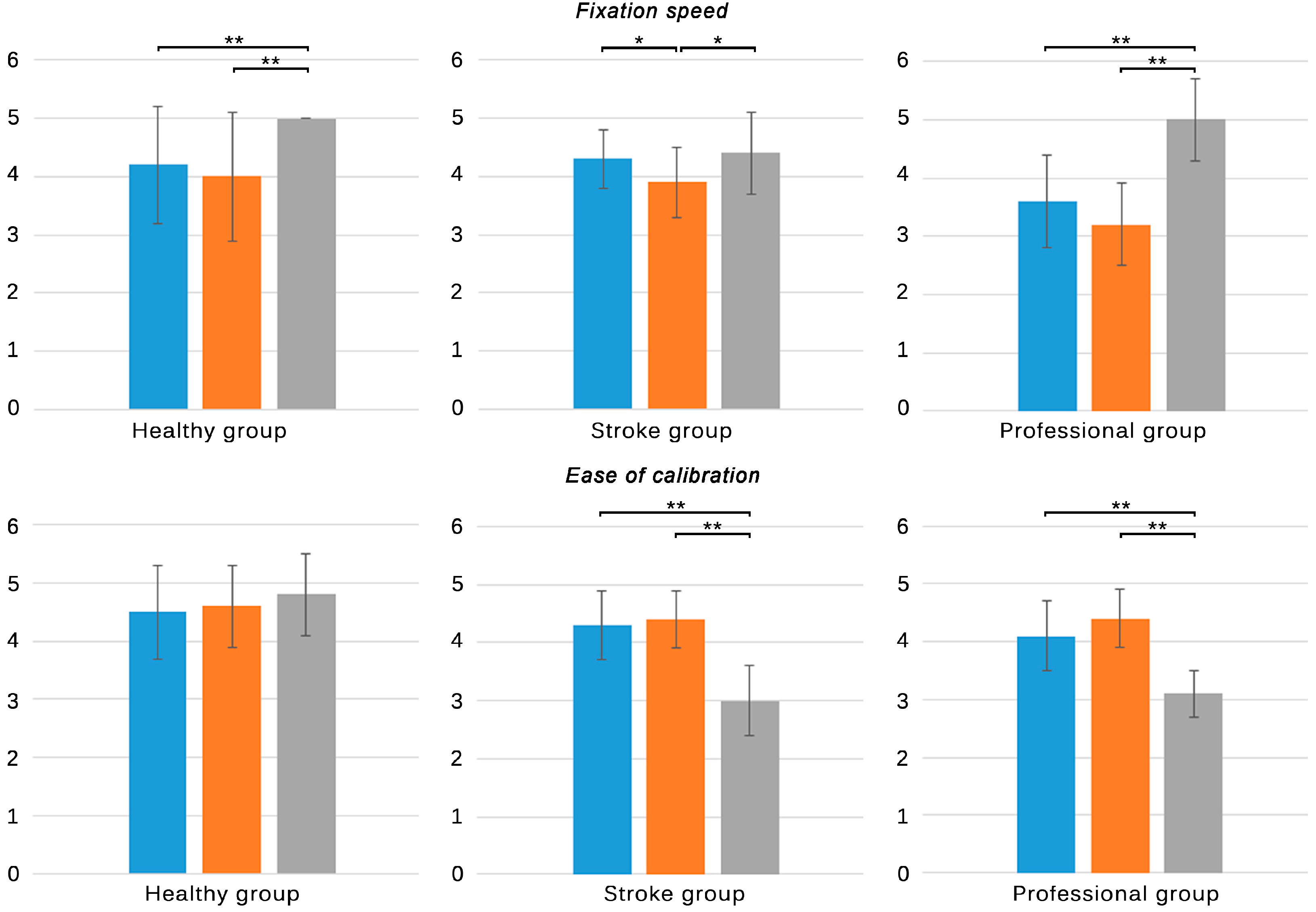 Subjective responses of healthy subjects and individuals with stroke to item five of questionnaire A. Blue: NaturalPoint® OptiTrackTM; Orange: PolhemusTM G4TM; Grey: Microsoft® KinectTM. Only significant differences are stated. * p < 0.05, ** p < 0.001.