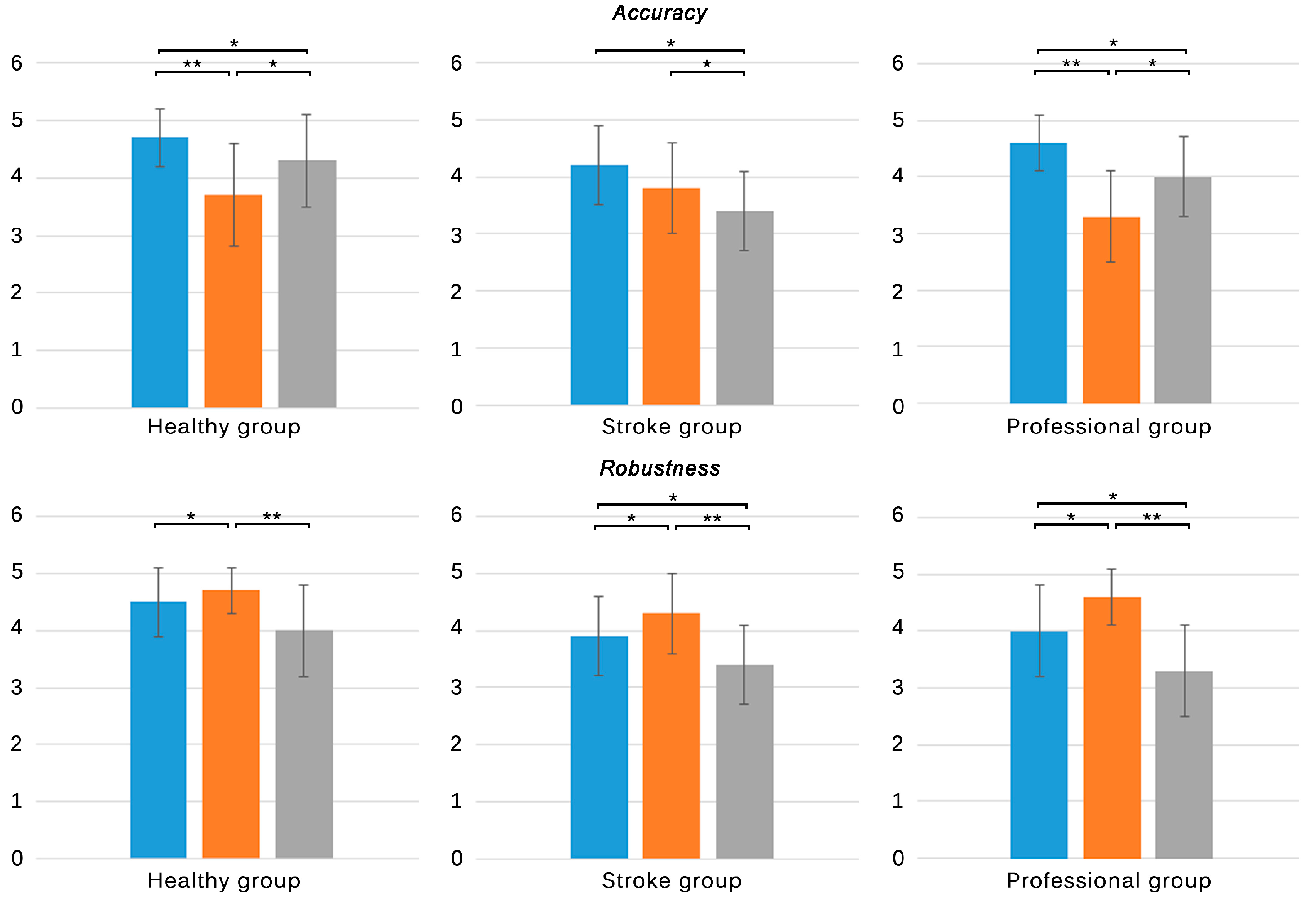 Similar conclusions can be inferred from the results of the robustness. In this case, all the groups defined the electromagnetic tracking solution as the most robust solution (p < 0.05), followed by the optical and the skeleton tracking system. Errors in the pose estimation could cause momentary maladjustments between the real and the virtual pose, which could be interpreted as a lack of robustness by all the participants, especially by individuals with stroke and professionals, who reported the lowest scores (3.4 ± 0.7 and 3.3 ± 0.8, respectively) (Table 3. A4/B4 item). The scores of the robustness were consistent with the jitter values derived from the study of the objective performance, indicating that this parameter could have been perceived as the most influential factor in the perception of robustness.