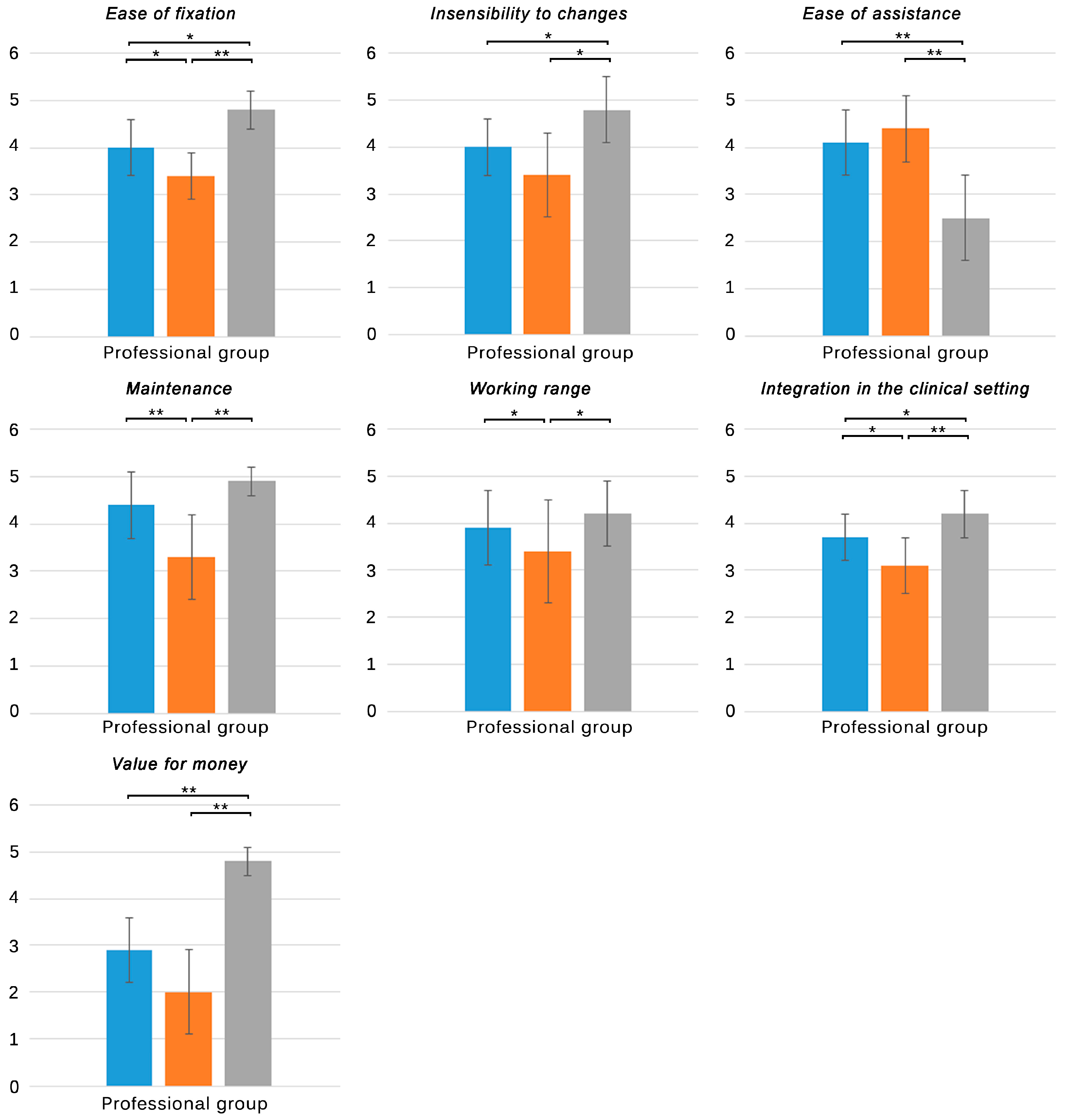 Therapists were also asked about the ease of fixation of the markers/sensors, the insensibility of the performance to changes in the clinical setting, the ease of assistance, the maintenance of the tracking system, the working range of the tracking solution, the integration in the clinical setting, and the value for money of each tracking system (Figure 6). With regards to the ease of fixation, the professional group evaluated the skeleton tracking with the highest score, followed by the optical and the electromagnetic system (Table 3. B5 item). These results are consistent with the scores in the fixation speed. While the skeleton tracking did not use either markers or sensors, the other solutions required therapists to fix the markers in the ankle joint of the patients and the electromagnetic solution, in addition, required the fixation of the hub and the careful placement of the wires in order to avoid tangles. The time and ease of fixation are crucial factors that must be minimized in the clinic, where time is limited and should be dedicated to the physical therapy [29,30,31].
