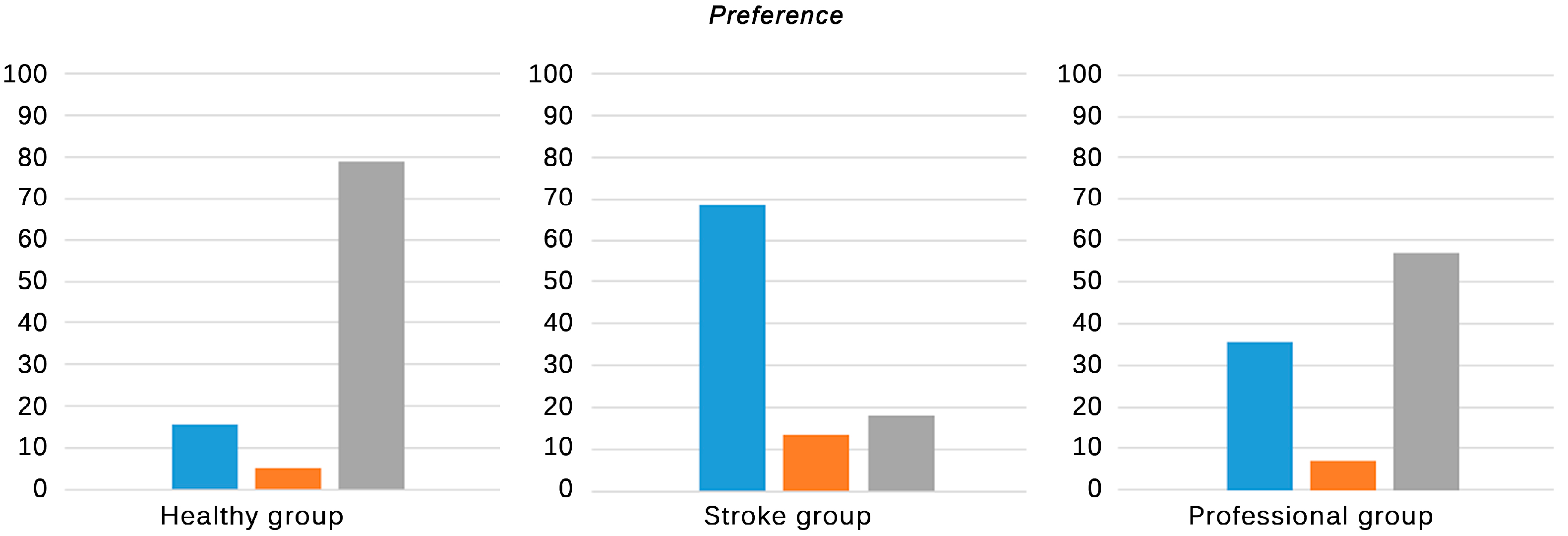 Finally, all the groups were asked about their order of preference (Figure 7). The healthy group mostly preferred the Microsoft® KinectTM (79.0%), over the other tracking systems, which is consistent with their scores to the comfort item (Table 3. A8/B12 item). These results can be explained by the fact that healthy individuals appreciated the comfort of this system over its worse accuracy or robustness. Remarkably, this group did not experience significant problems when interacting with the system and did not need assistance of the therapists, as the KinectTM is oriented towards healthy population. In contrast, the stroke group mostly preferred the optical tracking system (68.2%). The mentioned issues derived from a wrong skeleton fitting, more common in this group due to their motor restrictions, could have influenced their choice in the same way as it could have influenced their perceived success and agreement with the results. These facts should be specially taken into account when working with individuals with stroke, since they are likely to present behavioral problems [32], as irritability or depression, which can make this population particularly prone to frustration and reduce the benefits of rehabilitation [33]. In consequence, the use of the KinectTM as a tracking system for individuals with stroke could be restricted to subjects with specific motor conditions. The therapists mostly preferred the skeleton tracking (57.1%), slightly over the optical solution (35.7%). This result could be explained as a trade-off between both systems. In spite the ease and speed of the Kinect™ startup and its ease of maintenance, the aforementioned issues with the KinectTM can make the interaction of some patients difficult. The optical solution can overcome most of the interaction problems but it presents, however, some environmental restrictions (mainly light-related effects) that can affect their clinical use. It is important to highlight that, though the skeleton tracking system initially posed a challenge for the therapists, once they knew its functional limits, they were able to assist the patients. This fact, together with its affordable cost, could have led them to finally adopt the skeleton tracking solution over the other systems, and can be the reason why they are using it currently in their daily practice.